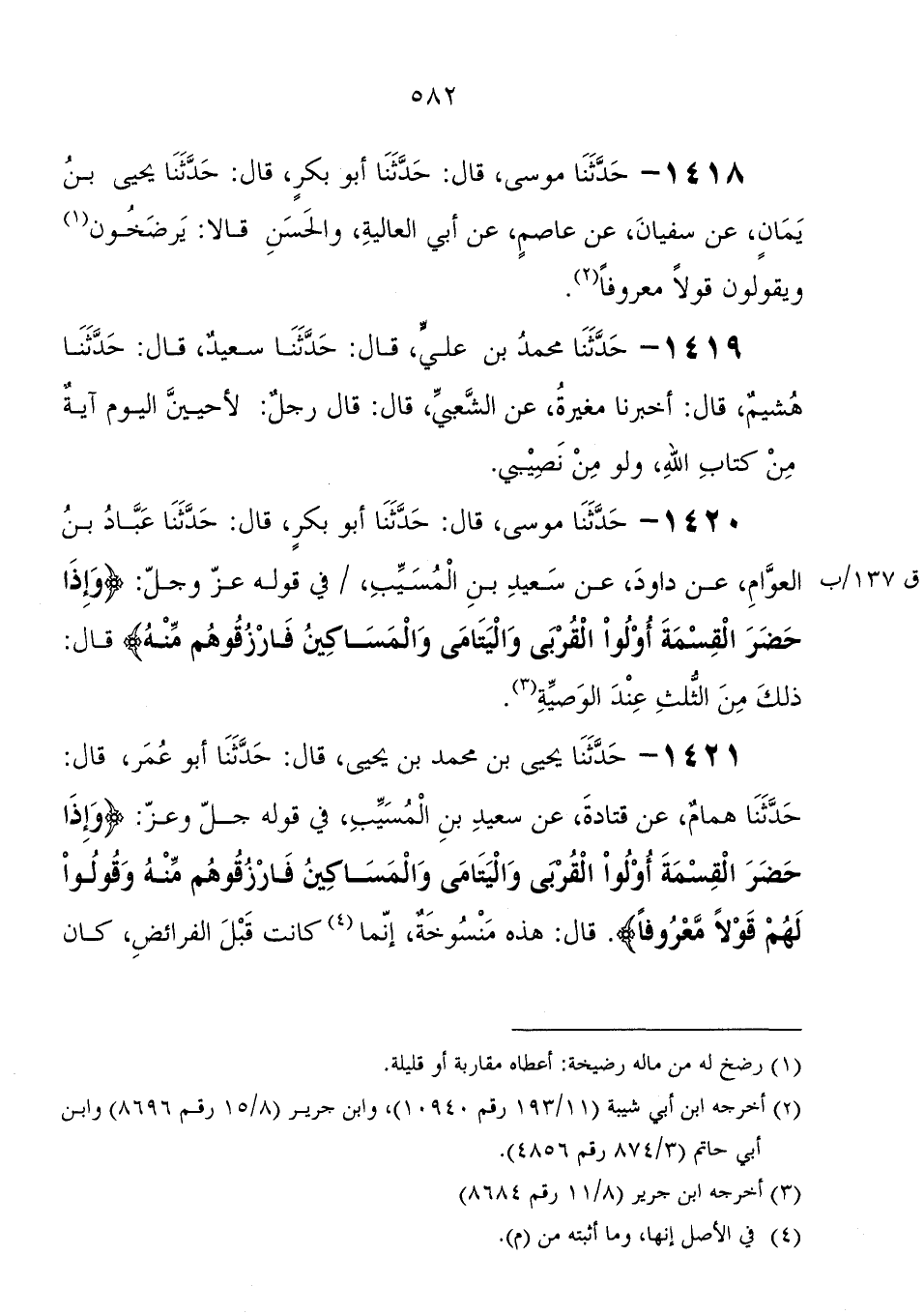 1420 - حَدَّثَنَا مُوسَى، قَالَ: حَدَّثَنَا أَبُو بكر، قَالَ: حَدَّثَنَا عباد بْن العوام، عَنْ داود، عَنْ سعيد بْن المسيب، فِي قوله عَزَّ وَجَلَّ " {وَإِذَا حَضَرَ الْقِسْمَةَ أُولُو الْقُرْبَى وَالْيَتَامَى وَالْمَسَاكِينُ فَارْزُقُوهُمْ مِنْهُ} قَالَ: ذَلِكَ من الثلث عند الوصية "