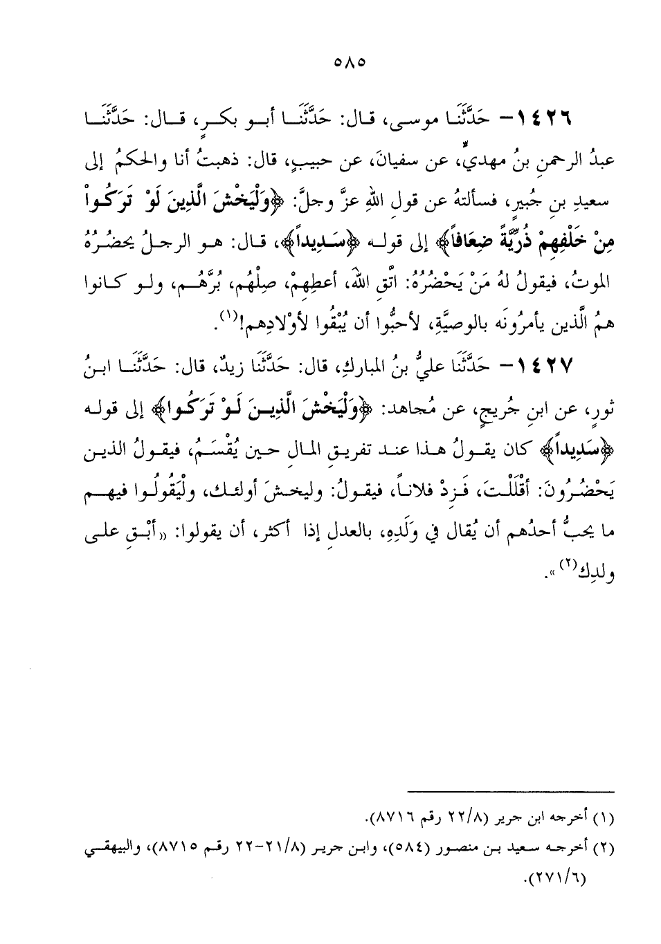 1426 - حَدَّثَنَا مُوسَى، قَالَ: حَدَّثَنَا أَبُو بكر، قَالَ: حَدَّثَنَا عَبْد الرَّحْمَنِ بْن مهدي، عَنْ سُفْيَانَ، عَنْ حبيب، قَالَ " ذهبت أنا والحكم إِلَى سعيد بْن جبير، فسألته عَنْ قوله عَزَّ وَجَلَّ: {وَلْيَخْشَ الَّذِينَ لَوْ تَرَكُوا مِنْ خَلْفِهِمْ ذُرِّيَّةً ضِعَافًا} إِلَى قوله {سَدِيدًا} ، قَالَ: هُوَ الرجل يحضره الموت، فيقول له من يحضره: اتق الله، أعطيهم، صلهم، برهم، ولو كَانُوا هم الَّذِينَ يأمرونه بالوصية، لأحبوا أن يبقوا لأولادهم "
