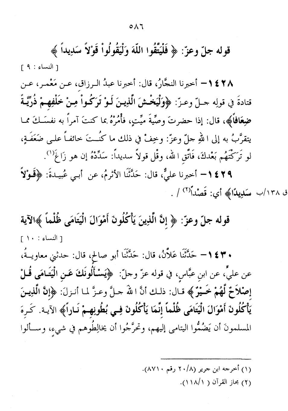 1428 - أَخْبَرَنَا النجار، قَالَ: أَخْبَرَنَا عَبْد الرزاق، عَنْ معمر، عَنْ قتادة فِي قوله جَلَّ وَعَزَّ " {وَلْيَخْشَ الَّذِينَ لَوْ تَرَكُوا مِنْ خَلْفِهِمْ ذُرِّيَّةً ضِعَافًا} ، قَالَ: إذا حضرت وصية ميت، فأمره بما كنت آمرا به نفسك مما يتقرب به إِلَى الله جَلَّ وَعَزَّ: وخف فِي ذَلِكَ مَا كنت خائفا عَلَى ضعفه، لو تركتهم بعدك، فاتق الله، وقل قولا سديدا: سدده إن هُوَ زاغ "