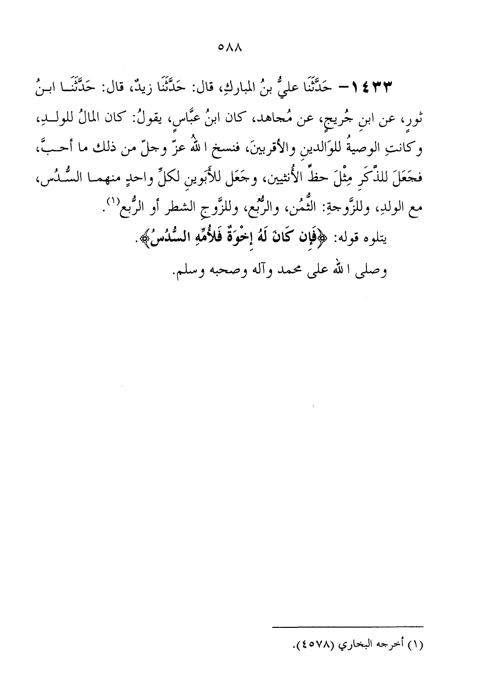 1433 - حَدَّثَنَا عَلِيُّ بْنُ الْمُبَارَكِ، قَالَ: حَدَّثَنَا زَيْدٌ، قَالَ: حَدَّثَنَا ابْنُ ثَوْرٍ، عَنِ ابْنِ جُرَيْجٍ، عَنْ مُجَاهِدٍ، كَانَ ابْنُ عَبَّاسٍ، يَقُولُ: " كَانَ الْمَالُ لِلْوَلَدِ، وَكَانَتِ الْوَصِيَّةُ لِلْوَالِدَيْنِ وَالأَقْرَبِينَ، فَنَسَخَ اللهُ عَزَّ وَجَلَّ مِنْ ذَلِكَ مَا أَحَبَّ، فَجَعَلَ لِلذَّكَرِ مِثْلَ حَظِّ الأُنْثَيَيْنِ، وَجَعَلَ لِلأَبَوَيْنِ لِكُلِّ وَاحِدٍ مِنْهُمَا السُّدُسَ مَعَ الْوَلَدِ، وَلِلزَّوْجَةِ: الثُّمُنَ، وَالرُّبُعَ، وَلِلزَّوْجِ الشَّطْرَ أَوِ الرُّبُعَ " يتلوه قوله: {فَإِنْ كَانَ لَهُ إِخْوَةٌ فَلأُمِّهِ السُّدُسُ} وصلى الله عَلَى مُحَمَّد وآله وصحبه وسلم