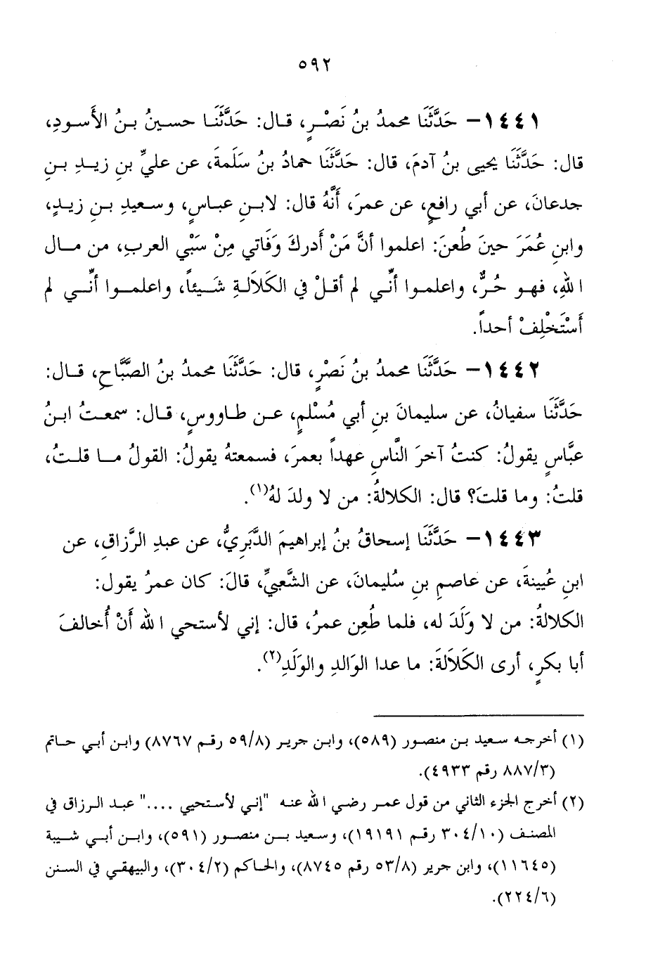 1443 - حَدَّثَنَا إِسْحَاقُ بْنُ إِبْرَاهِيمَ الدَّبَرِيُّ، عَنْ عَبْدِ الرَّزَّاقِ، عَنِ ابْنِ عُيَيْنَةَ، عَنْ عَاصِمِ بْنِ سُلَيْمَانَ، عَنِ الشَّعْبِيِّ، قَالَ: كَانَ عُمَرُ يَقُولُ: " الْكَلالَةُ: مَنْ لا وَلَدَ لَهُ "، فَلَمَّا طُعِنَ عُمَرُ، قَالَ: " إِنِّي لأَسْتَحِي اللهَ أَنْ أُخَالِفَ أَبَا بَكْرٍ، أَرَى الْكَلالَةَ: مَا عَدَا الْوَلَدَ وَالْوَالِدَ "