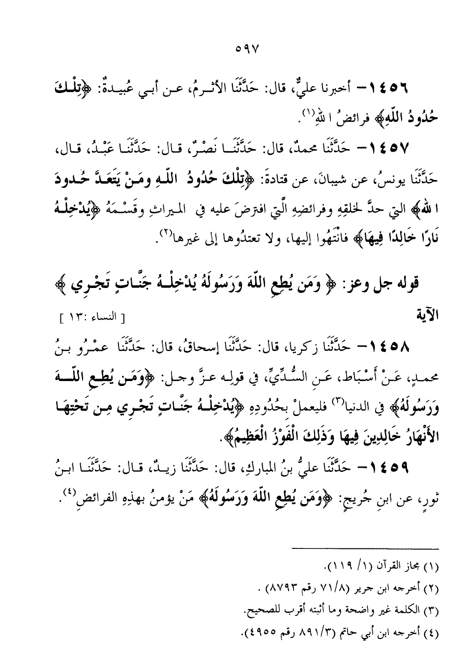 1457 - حَدَّثَنَا مُحَمَّد، قَالَ: حَدَّثَنَا نصر، قَالَ: حَدَّثَنَا عبد، قَالَ، حَدَّثَنَا يونس، عَنْ شيبان، عَنْ قتادة " {تِلْكَ حُدُودُ اللهِ} ومن يتعد حدود الله الَّتِي حد لخلقه وفرائضه الَّتِي افترض عَلَيْهِ فِي الميراث وقسمه {يُدْخِلْهُ نَارًا خَالِدًا فِيهَا} فانتهوا إليها، ولا تعتدوها إِلَى غيرها "