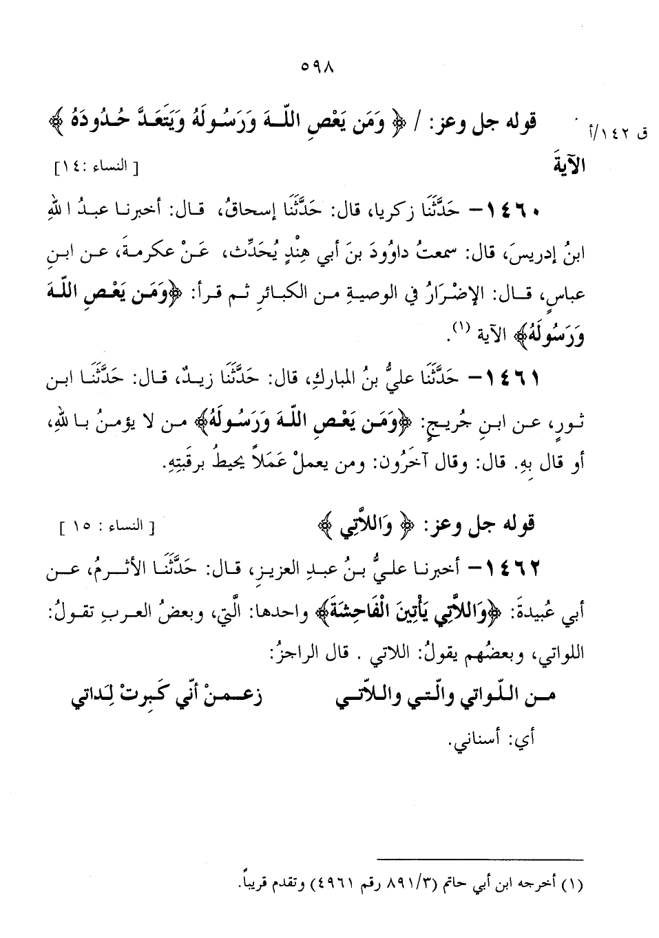 1460 - حَدَّثَنَا زَكَرِيَّا، قَالَ: حَدَّثَنَا إِسْحَاقُ، قَالَ: أَخْبَرَنَا عَبْدُ اللهِ بْنُ إِدْرِيسَ، قَالَ: سَمِعْتُ دَاوُدَ بْنِ أَبِي هِنْدٍ، يُحَدِّثُ عَنْ عِكْرِمَةَ، عَنِ ابْنِ عَبَّاسٍ، قَالَ: " الإِضْرَارُ فِي الْوَصِيَّةِ مِنَ الْكَبَائِرِ، ثُمَّ قَرَأَ: {وَمَنْ يَعْصِ اللهَ وَرَسُولَهُ} الآيَةَ "