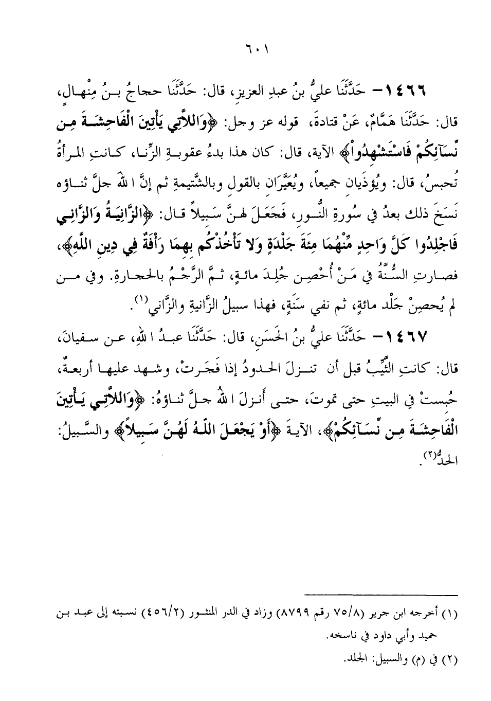1466 - حَدَّثَنَا عَلِيُّ بْنُ عَبْدِ الْعَزِيزِ، قَالَ: حَدَّثَنَا حجاج بْن منهال، قَالَ: حَدَّثَنَا همام، عَنْ قتادة، قوله عَزَّ وَجَلَّ " {وَاللَّاتِي يَأْتِينَ الْفَاحِشَةَ مِنْ نِسَائِكُمْ فَاسْتَشْهِدُوا} الآية، قَالَ: كَانَ هَذَا بدء عقوبة الزنا، كانت المرأة تحبس، قَالَ: ويؤذيان جميعا، ويعيران بالقول وبالشتيمة، ثم إن الله جل ثناؤه نسخ ذَلِكَ بعد فِي سورة النور، فجعل لهن سبيلا، قَالَ: الزَّانِيَةُ وَالزَّانِي فَاجْلِدُوا كُلَّ وَاحِدٍ مِنْهُمَا مِائَةَ جَلْدَةٍ وَلا تَأْخُذْكُمْ بِهِمَا رَأْفَةٌ فِي