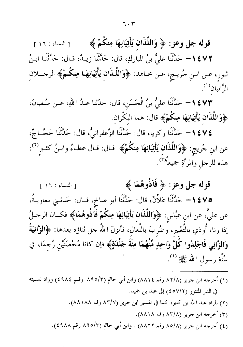 1473 - حَدَّثَنَا عَلِيُّ بْنُ الحسين، قَالَ: حَدَّثَنَا عَبْد اللهِ، عَنْ سُفْيَان " {وَاللَّذَانِ يَأْتِيَانِهَا مِنْكُمْ} قَالَ: هما البكران.