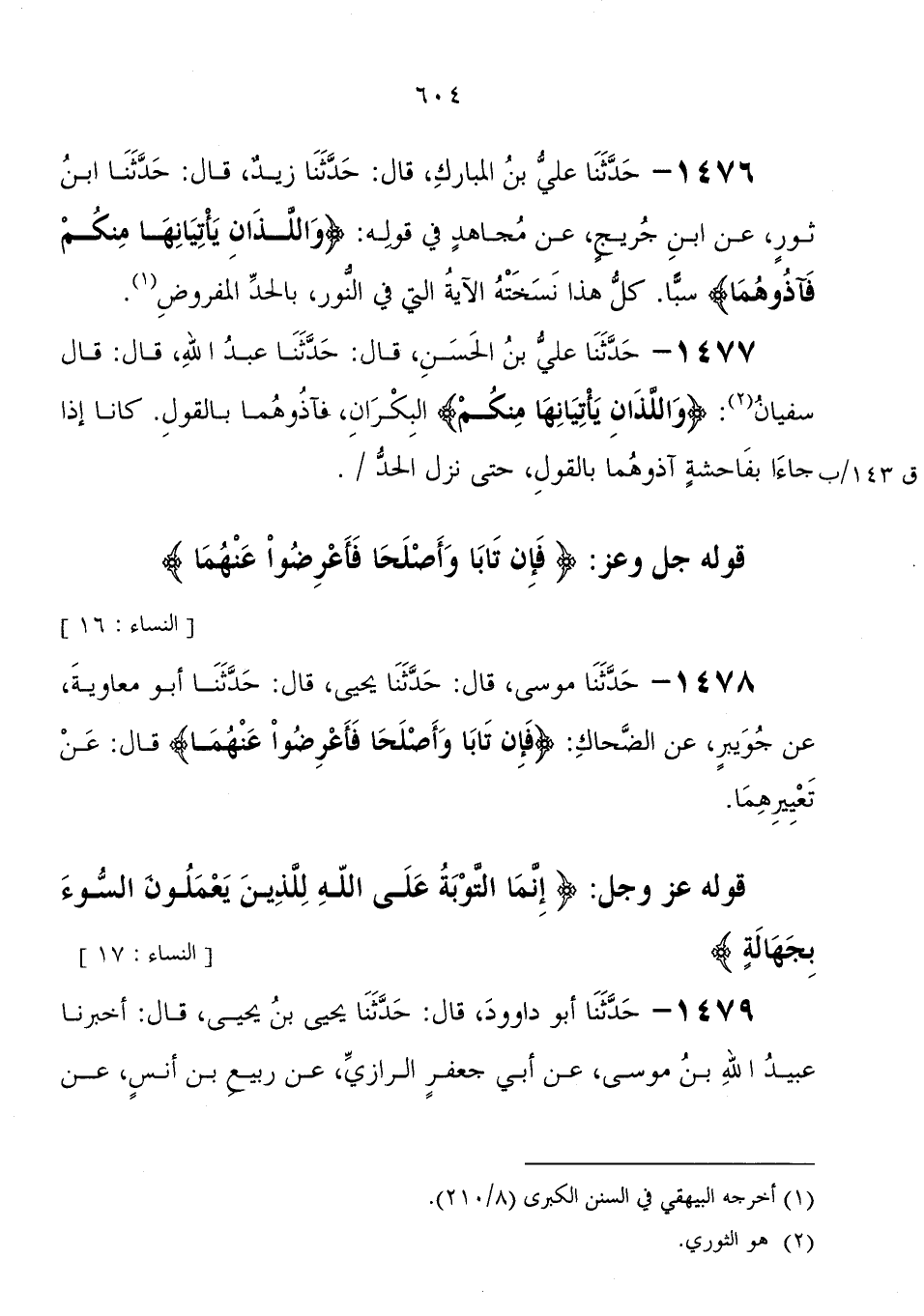 1476 - حَدَّثَنَا عَلِيُّ بْنُ الْمُبَارَكِ، قَالَ: حَدَّثَنَا زَيْدٌ، قَالَ: حَدَّثَنَا ابْنُ ثَوْرٍ، عَنِ ابْنِ جُرَيْجٍ، عَنْ مجاهد فِي قوله " {وَاللَّذَانِ يَأْتِيَانِهَا مِنْكُمْ فَآذُوهُمَا} سبا كل هَذَا نسخته الآية الَّتِي فِي النور بالحد المفروض "