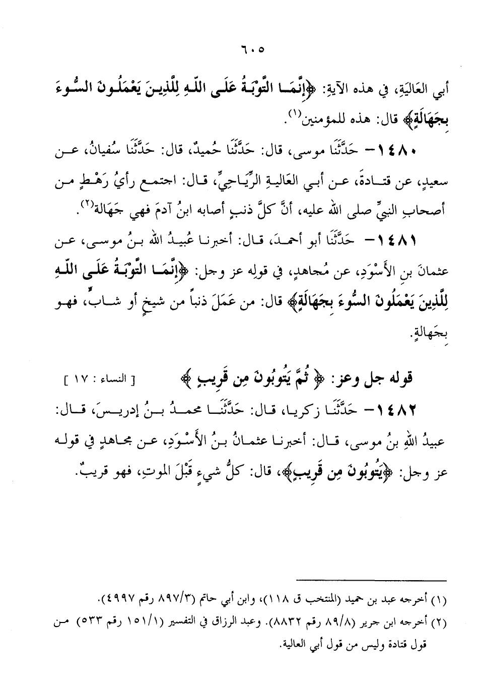 1480 - حَدَّثَنَا مُوسَى، قَالَ: حَدَّثَنَا حميد، قَالَ: حَدَّثَنَا سُفْيَانُ، عَنْ سعيد، عَنْ قتادة، عَنْ أبي العالية الرياحي، قَالَ: " اجتمع رأي رهط من أصحاب النَّبِيّ صَلَّى اللَّهُ عَلَيْهِ وَسَلَّمَ، أن كل ذنب أصابه ابْن آدم فهي جهالة "