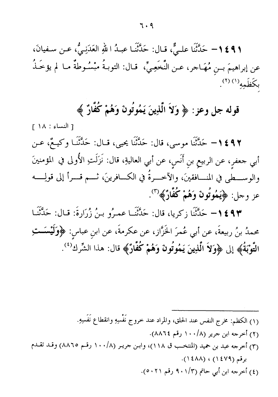 1493 - حَدَّثَنَا زَكَرِيَّا، قَالَ: حَدَّثَنَا عَمْرُو بْنُ زُرَارَةَ قَالَ: حَدَّثَنَا مُحَمَّدُ بْنُ رَبِيعَةَ، عَنْ أَبِي عُمَرَ الْخَزَّازُ، عَنْ عِكْرِمَةَ، عَنِ ابْنِ عَبَّاسٍ " وَلَيْسَتِ التَّوْبَةُ إِلَى {وَلا الَّذِينَ يَمُوتُونَ وَهُمْ كُفَّارٌ} قَالَ: هَذَا الشِّرْكُ "