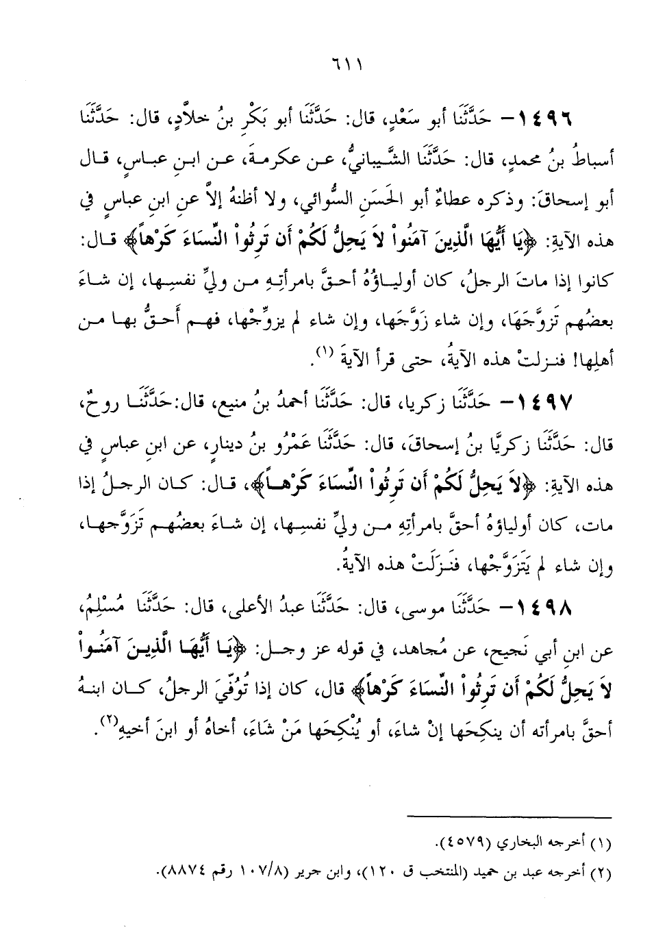 1497 - حَدَّثَنَا زَكَرِيَّا، قَالَ: حَدَّثَنَا أَحْمَدُ بْنُ مَنِيعٍ، قَالَ: حَدَّثَنَا رَوْحٌ، قَالَ: حَدَّثَنَا زَكَرِيَّا بْنُ إِسْحَاقَ، قَالَ: حَدَّثَنَا عَمْرُو بْنُ دِينَارٍ، عَنِ ابْنِ عَبَّاسٍ، فِي هَذِهِ الآيَةِ " {لا يَحِلُّ لَكُمْ أَنْ تَرِثُوا النِّسَاءَ كَرْهًا} ، قَالَ: كَانَ الرَّجُلُ إِذَا مَاتَ، كَانَ أَوْلِيَاؤُهُ أَحَقَّ بِامْرَأَتِهِ مِنْ وَلِيِّ نَفْسِهَا، إِنْ شَاءَ بَعْضُهُمْ تَزَوَّجَهَا، وَإِنْ شَاءَ لَمْ يَتَزَوَّجْهَا، فَنَزَلَتْ هَذِهِ الآيَةُ "