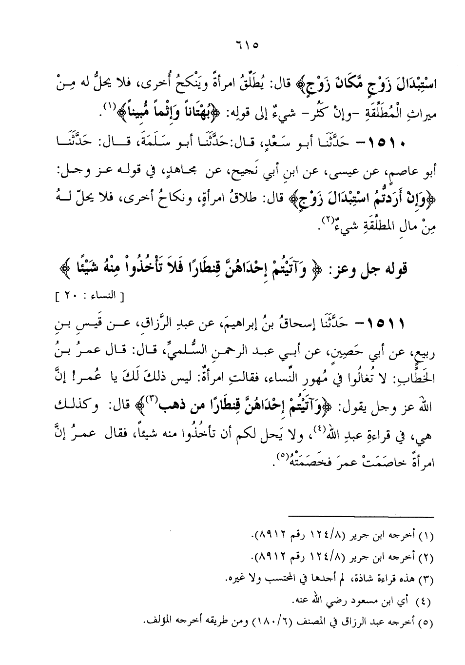1510 - حَدَّثَنَا أَبُو سَعْدٍ، قَالَ: حَدَّثَنَا أَبُو سلمة، قَالَ: حَدَّثَنَا أَبُو عاصم، عَنْ عيسى، عَنْ ابْن أبي نجيح، عَنْ مجاهد، فِي قوله عَزَّ وَجَلَّ " {وَإِنْ أَرَدْتُمُ اسْتِبْدَالَ زَوْجٍ} قَالَ: طلاق امرأة، ونكاح أخرى، فلا يحل له من مال المطلقة شيء "