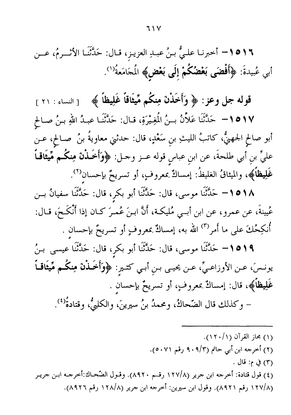 1517 - حَدَّثَنَا عَلانُ بْنُ الْمُغِيرَةِ، قَالَ: حَدَّثَنَا عَبْدُ اللهِ بْنُ صَالِحٍ أَبُو صَالِحٍ الْجُهَنِيُّ كَاتِبُ اللَّيْثِ بْنُ سَعْدٍ، قَالَ: حَدَّثَنِي مُعَاوِيَةُ بْنُ صَالِحٍ، عَنْ عَلِيِّ بْنِ أَبِي طَلْحَةَ، عَنِ ابْنِ عَبَّاسٍ، قوله عَزَّ وَجَلَّ " {وَأَخَذْنَ مِنْكُمْ مِيثَاقًا غَلِيظًا} ، وَالْمِيثَاقُ الْغَلِيظُ: إِمْسَاكٌ بِمَعْرُوفٍ، أَوْ تَسْرِيحٌ بِإِحْسَانٍ "