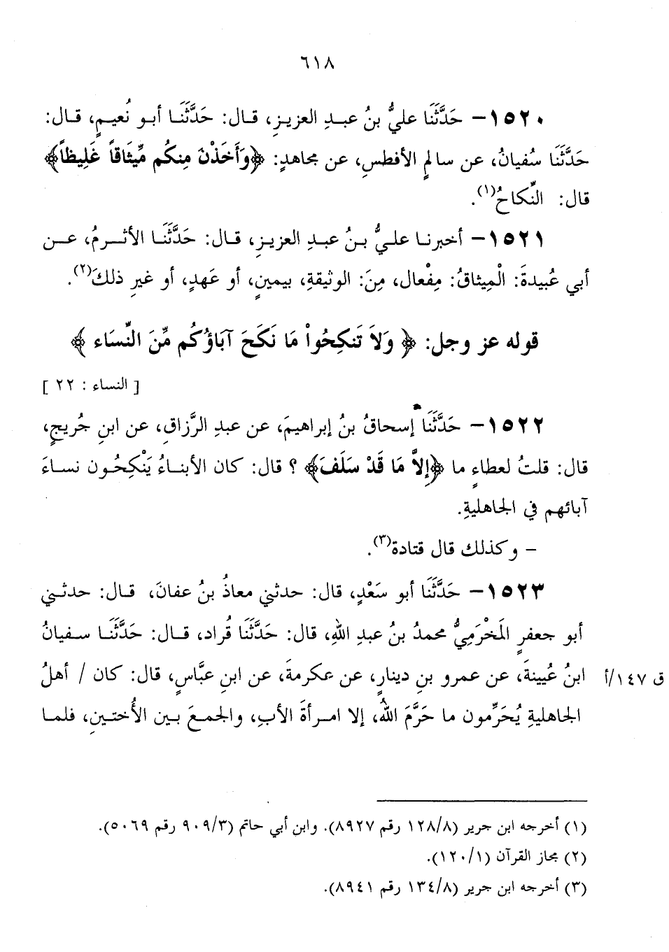 1520 - حَدَّثَنَا عَلِيُّ بْنُ عَبْدِ الْعَزِيزِ، قَالَ: حَدَّثَنَا أَبُو نعيم، قَالَ: حَدَّثَنَا سُفْيَانُ، عَنْ سالم الأفطس، عَنْ مجاهد " {وَأَخَذْنَ مِنْكُمْ مِيثَاقًا غَلِيظًا} قَالَ النكاح "