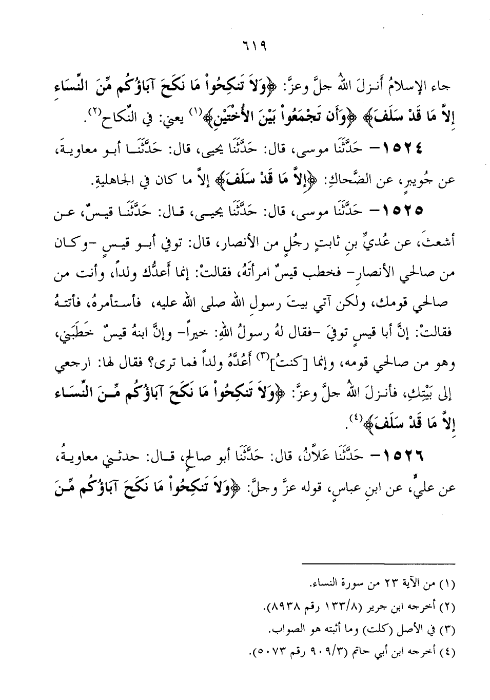 1524 - حَدَّثَنَا مُوسَى، قَالَ: حَدَّثَنَا يَحْيَى، قَالَ: حَدَّثَنَا أَبُو معاوية، عَنْ جويبر، عَنْ الضحاك " {إِلا مَا قَدْ سَلَفَ} إِلا مَا كَانَ فِي الجاهلية "