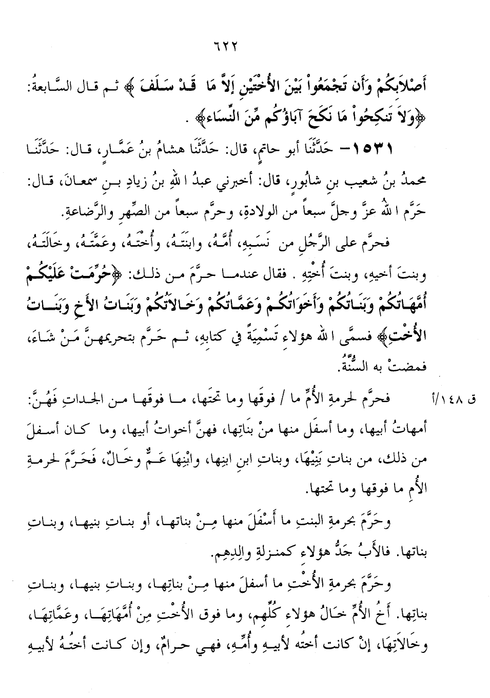 1531 - حَدَّثَنَا أَبُو حاتم، قَالَ: حَدَّثَنَا هشام بْن عمار، قَالَ: حَدَّثَنَا مُحَمَّد بْن شعيب بْن شابور، قَالَ: أخبرني عَبْد اللهِ بْن زياد بْن سمعان، قَالَ " حرم الله عَزَّ وَجَلَّ سبعا من الولادة، وحرم سبعا من الصهر والرضاعة، فحرم عَلَى الرجل من نسبه، أمه، وابنته، وأخته، وعمته، وخالته، وبنت أخيه، وبنت أخته فَقَالَ عندما حرم من ذَلِكَ: {حُرِّمَتْ عَلَيْكُمْ أُمَّهَاتُكُمْ وَبَنَاتُكُمْ وَأَخَوَاتُكُمْ وَعَمَّاتُكُمْ وَخَالاتُكُمْ وَبَنَاتُ الأَخِ وَبَنَاتُ الأُخْتِ} فسمى الله هَؤُلاءِ تسمية فِي كتابه، ثم حرم بتحريمهن من شاء، فمضت به السنة، فحرم لحرمة الأم مَا فوقها
