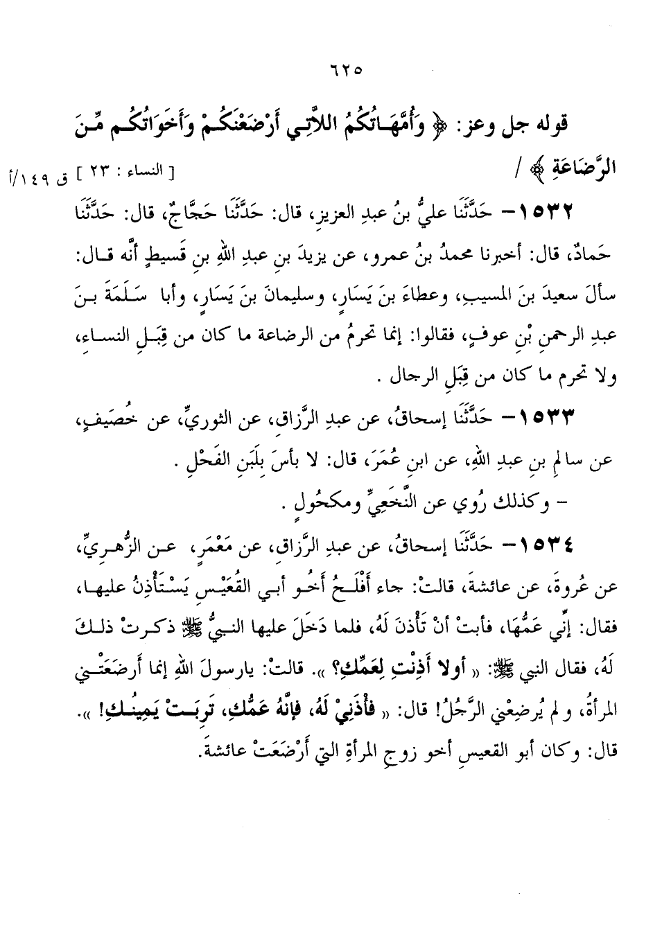 1534 - حَدَّثَنَا إِسْحَاقُ، عَنْ عَبْدِ الرَّزَّاقِ، عَنْ مَعْمَرٍ، عَنِ الزُّهْرِيِّ، عَنْ عُرْوَةَ، عَنْ عَائِشَةَ، قَالَتْ: جَاءَ أَفْلَحُ أَخُو أَبِي الْقُعَيْسِ يَسْتَأْذِنُ عَلَيْهَا، فَقَالَ: إِنِّي عَمُّهَا، فَأَبَتْ أَنْ تَأْذَنَ لَهُ، فَلَمَّا دَخَلَ عَلَيْهَا النَّبِيُّ صَلَّى اللَّهُ عَلَيْهِ وَسَلَّمَ ذَكَرْتُ ذَلِكَ لَهُ، فَقَالَ النَّبِيُّ صَلَّى اللَّهُ عَلَيْهِ وَسَلَّمَ: " أَوَلا أَذِنْتِ لِعَمِّكِ؟ " قَالَتْ: يَا رَسُولَ اللهِ، إِنَّمَا أَرْضَعَتْنِي الْمَرْأَةُ، وَلَمْ يُرْضِعْنِي الرَّجُلُ، قَالَ: " فَأْذَنِي لَهُ، فَإِنَّهُ عَمُّكِ، تَرِبَتْ يَمِينُكِ " قَالَ: وَكَانَ أَبُو الْقُعَيْسِ أَخُو زَوْجِ الْمَرْأَةِ الَّتِي أَرْضَعَتْ عَائِشَةَ