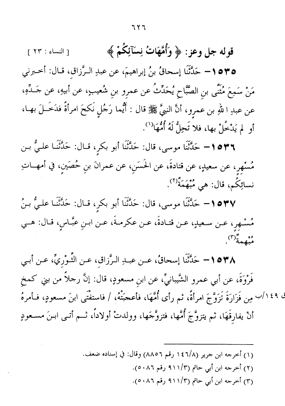 1536 - حَدَّثَنَا مُوسَى، قَالَ: حَدَّثَنَا أَبُو بَكْرٍ، قَالَ: حَدَّثَنَا عَلِيُّ بْنُ مُسْهِرٍ، عَنْ سَعِيدٍ، عَنْ قَتَادَةَ، عَنِ الْحَسَنِ، عَنْ عِمْرَانَ بْنِ حُصَيْنٍ، " فِي أُمَّهَاتِ نِسَائِكُمْ، قَالَ: هِيَ مُبْهَمَةٌ "