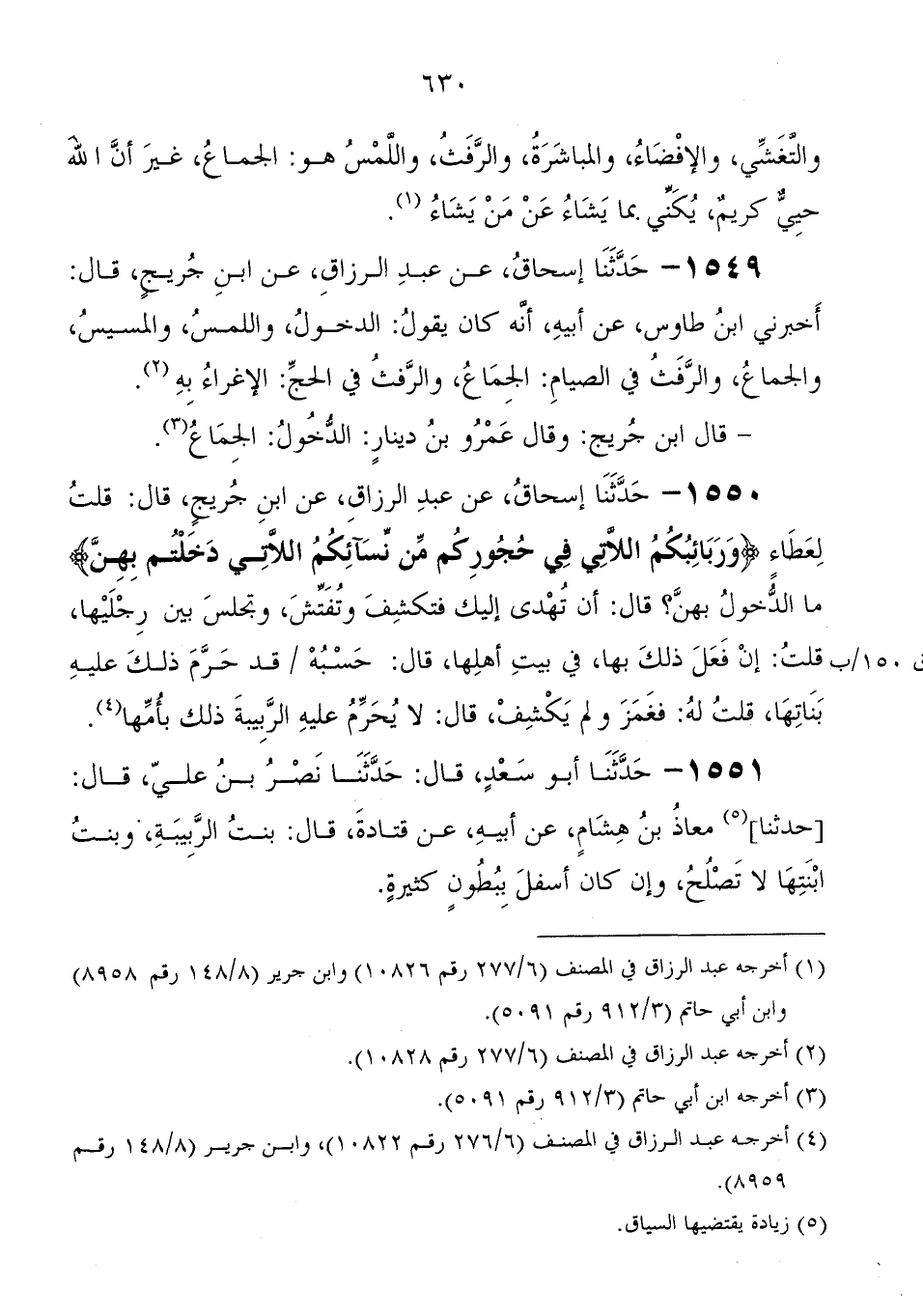 1550 - حَدَّثَنَا إِسْحَاق، عَنْ عَبْد الرزاق، عَنِ ابْنِ جُرَيْجٍ، قَالَ: قلت لعطاء " {وَرَبَائِبُكُمُ اللَّاتِي فِي حُجُورِكُمْ مِنْ نِسَائِكُمُ اللَّاتِي دَخَلْتُمْ بِهِنَّ} مَا الدخول بهن؟ قَالَ: " أن تهدى إليك فتكشف وتفتش، وتجلس بين رجليها، قلت: إن فعل ذَلِكَ بها، فِي بيت أهلها، قَالَ: حسبة قد حرم ذَلِكَ عَلَيْهِ بناتها، قلت له: فغمز ولم يكشف، قَالَ: لا يحرم عَلَيْهِ الربيبة ذَلِكَ بأمها "
