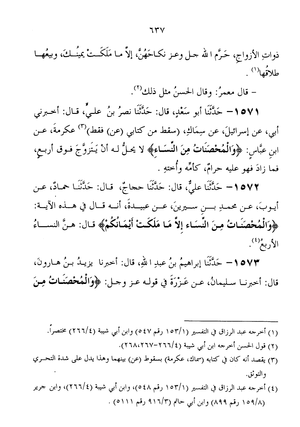 1572 - حَدَّثَنَا علي، قَالَ: حَدَّثَنَا حجاج، قَالَ: حَدَّثَنَا حماد، عَنْ أيوب، عَنْ مُحَمَّد بْن سيرين، عَنْ عبيدة، أنه قَالَ فِي هذه الآية: " {وَالْمُحْصَنَاتُ مِنَ النِّسَاءِ إِلا مَا مَلَكَتْ أَيْمَانُكُمْ} قَالَ: هن النساء الأربع "