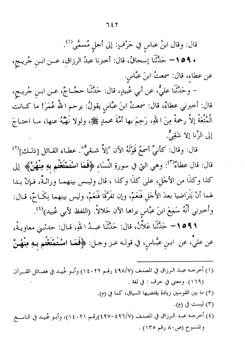 1590 - حَدَّثَنَا إِسْحَاقُ، قَالَ: أَخْبَرَنَا عَبْدُ الرَّزَّاقِ، عَنِ ابْنِ جُرَيْجٍ، عَنْ عَطَاءٍ، قَالَ: سَمِعْتُ ابْنَ عَبَّاسٍ، وَحَدَّثَنَا عَلِيٌّ، عَنْ أَبِي عُبَيْدٍ، قَالَ: حَدَّثَنَا حَجَّاجٌ، عَنِ ابْنِ جُرَيْجٍ، قَالَ: أَخْبَرَنِي عَطَاءٌ، قَالَ: سَمِعْتُ ابْنَ عَبَّاسٍ، يَقُولُ: " يَرْحَمُ اللهُ عُمَرَ، مَا كَانَتِ الْمُتْعَةُ إِلا رَحْمَةً مِنَ اللهِ، رَحِمَ بِهَا أُمَّةَ مُحَمَّدٍ صَلَّى اللَّهُ عَلَيْهِ وَسَلَّمَ، وَلَوْلا نَهْيُهُ عَنْهَا، مَا احْتَاجَ إِلَى الزِّنَا إِلا شَقِيٌّ " قَالَ: وَقَالَ: كأني أسمع قوله الآن إِلا شقي عطاء القائل ذَلِكَ قَالَ: قَالَ عطاء: وهي الَّتِي فِي سورة النساء {فَمَا اسْتَمْتَعْتُمْ بِهِ مِنْهُنَّ} إِلَى كذا وكذا من الأجل، عَلَى كذا وكذا، قَالَ وليس بينهما وراثة، فإن بدا لهما أن يتراضيا بعد الأجل فنعم، وإن تفرقا فنعم، وليس بينهما نكاح، قَالَ: وأخبرني أنه سمع ابْن عَبَّاس يراها الآن حلالا اللفظ لأبي عبيد