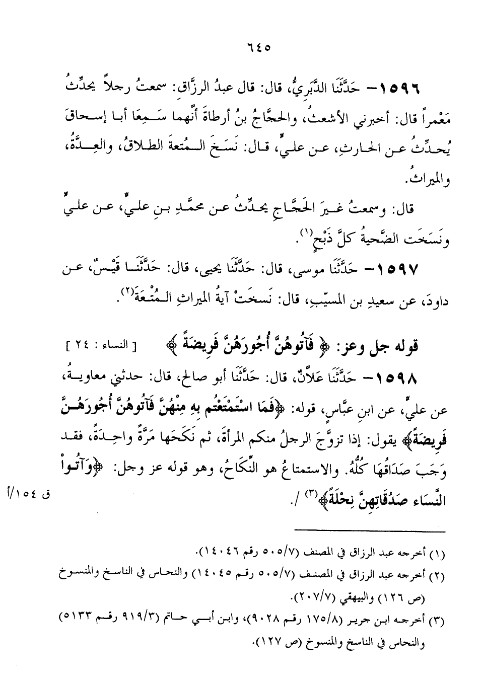1596 - حَدَّثَنَا الدَّبَرِيُّ، قَالَ: قَالَ عَبْدُ الرَّزَّاقِ سَمِعْتُ رَجُلا يُحَدِّثُ مَعْمَرًا، قَالَ: أَخْبَرَنِي الأَشْعَثُ، وَالْحَجَّاجُ بْنُ أَرْطَاةَ، أَنَّهُمَا سَمِعَا أَبَا إِسْحَاقَ، يُحَدِّثُ عَنِ الْحَارِثِ، عَنْ عَلِيٍّ، قَالَ: " نَسَخَ الْمُتْعَةَ الطَّلاقُ، وَالْعِدَّةُ، وَالْمِيرَاثُ " قَالَ: وسمعت غير الحجاج، يحدث عَنْ مُحَمَّد بْن علي، عَنْ علي، ونسخت الضحية كل ذبح "