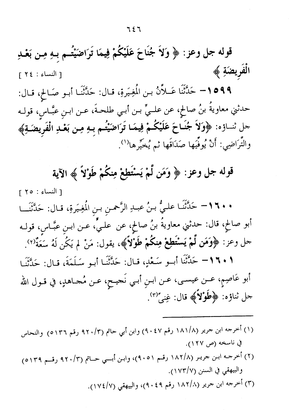 1600 - حَدَّثَنَا عَلِيُّ بْنُ عَبْدِ الرَّحْمَنِ بْنِ الْمُغِيرَةِ، قَالَ: حَدَّثَنَا أَبُو صَالِحٍ، قَالَ: حَدَّثَنِي مُعَاوِيَةُ بْنُ صَالِحٍ، عَنْ عَلِيٍّ، عَنِ ابْنِ عَبَّاسٍ، قوله جَلَّ وَعَزَّ: " {وَمَنْ لَمْ يَسْتَطِعْ مِنْكُمْ طَوْلا} ، يَقُولُ: مَنْ لَمْ يَكُنْ لَهُ سَعَةٌ "