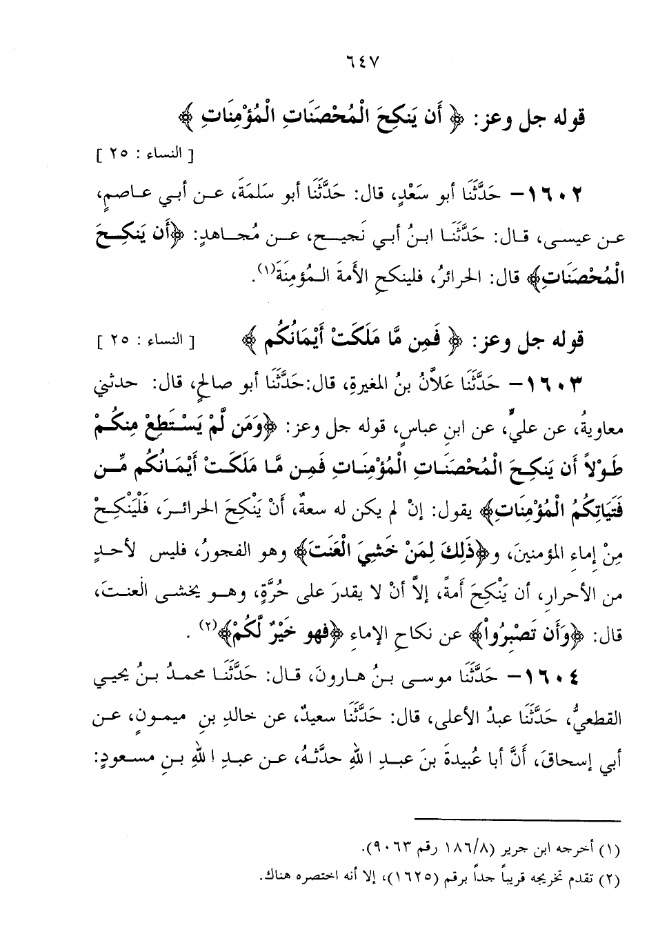 1602 - حَدَّثَنَا أَبُو سَعْدٍ، قَالَ: حَدَّثَنَا أَبُو سلمة، عَنْ أبي عاصم، عَنْ عيسى، قَالَ: حَدَّثَنَا ابْنُ أبي نجيح، عَنْ مجاهد " {أَنْ يَنْكِحَ الْمُحْصَنَاتِ الْمُؤْمِنَاتِ} قَالَ: الحرائر، فلينكح الأمة المؤمنة "