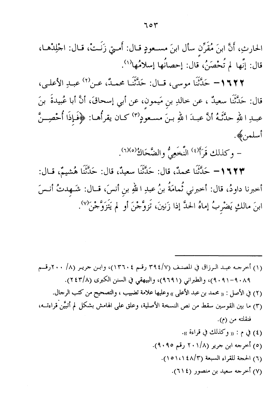 1622 - حَدَّثَنَا مُوسَى، قَالَ: حَدَّثَنَا مُحَمَّدٌ، عَنْ عَبْدِ الأَعْلَى، قَالَ: حَدَّثَنَا سَعِيدٌ، عَنْ خَالِدِ بْنِ مَيْمُونٍ، عَنْ أَبِي إِسْحَاقَ، أَنَّ أَبَا عُبَيْدَةَ بْنَ عَبْدِ اللهِ، حَدَّثَهُ أَنَّ عَبْدَ اللهِ بْنَ مَسْعُودٍ كَانَ يَقْرَأَهَا " فَإِذَا أُحْصِنَّ أَسْلَمْنَ " وَكَذَلِكَ قَرَأَ النَّخَعِيُّ وَالضَّحَّاكُ