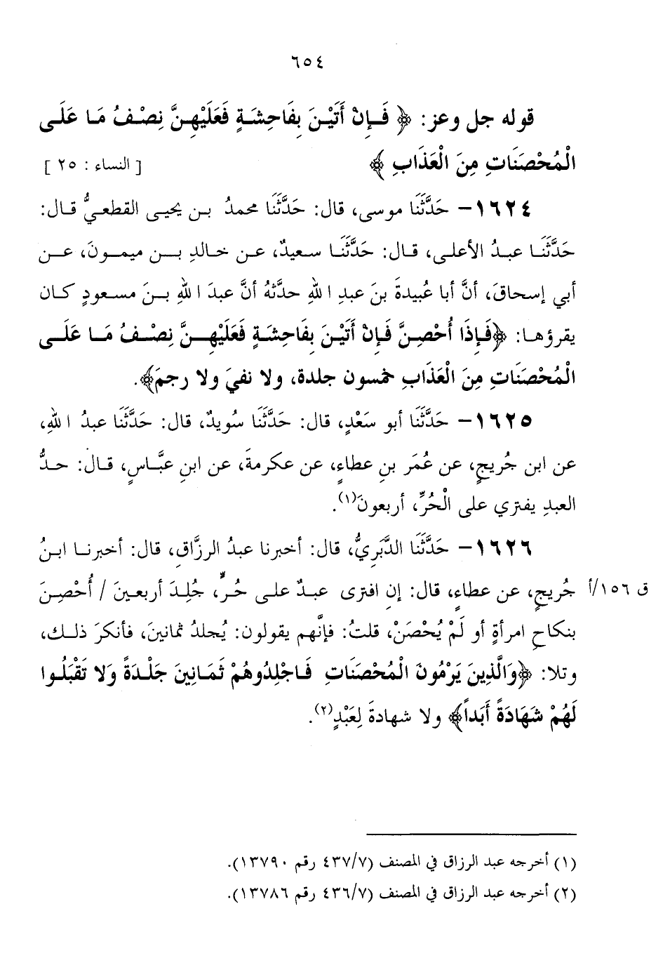 1624 - حَدَّثَنَا مُوسَى، قَالَ: حَدَّثَنَا مُحَمَّدُ بْنُ يَحْيَى الْقُطَعِيُّ، قَالَ: حَدَّثَنَا عَبْدُ الأَعْلَى، قَالَ: حَدَّثَنَا سَعِيدٌ، عَنْ خَالِدِ بْنِ مَيْمُونٍ، عَنْ أَبِي إِسْحَاقَ، أَنَّ أَبَا عُبَيْدَةَ بْنَ عَبْدِ اللهِ، حَدَّثَهُ أَنَّ عَبْدَ اللهِ بْنَ مَسْعُودٍ، كَانَ يَقْرَؤُهَا " فَإِذَا أُحْصِنَّ فَإِنْ أَتَيْنَ بِفَاحِشَةٍ فَعَلَيْهِنَّ نَصْفُ مَا عَلَى الْمُحْصَنَاتِ مِنَ الْعَذَابِ خَمْسُونَ جَلْدَةً وَلا نَفْيٌ وَلا رَجْمٌ "