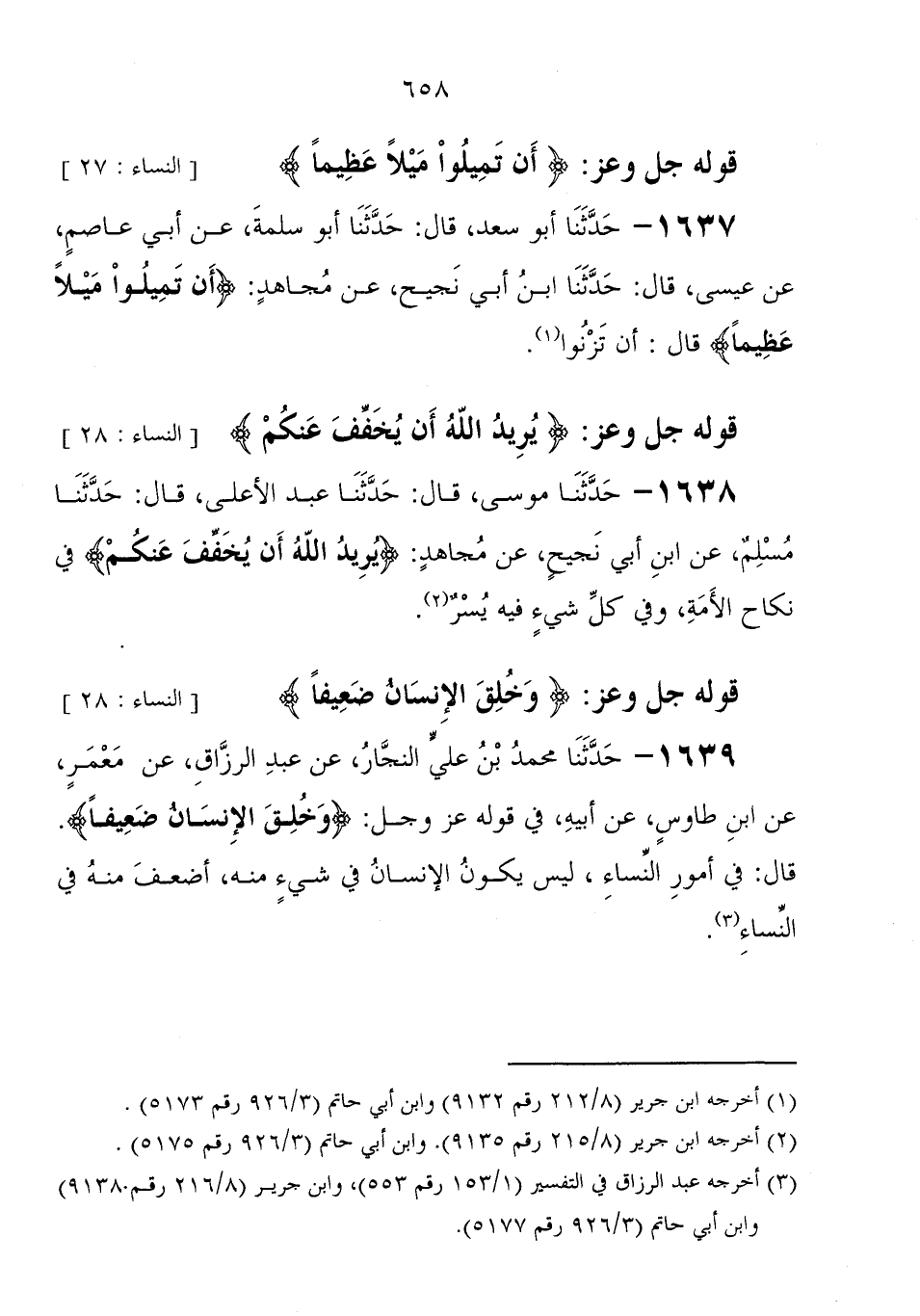 1637 - حَدَّثَنَا أَبُو سَعْدٍ، قَالَ: حَدَّثَنَا أَبُو سلمة، عَنْ أبي عاصم، عَنْ عيسى، قَالَ: حَدَّثَنَا ابْنُ أبي نجيح، عَنْ مجاهد " {أَنْ تَمِيلُوا مَيْلا عَظِيمًا} قَالَ: أن تزنوا "