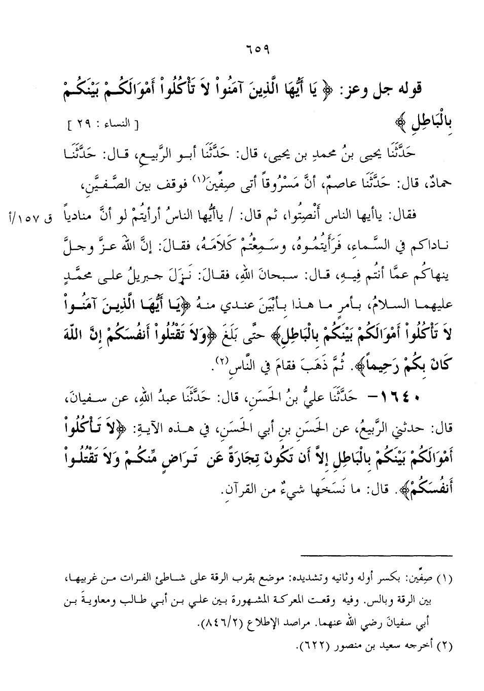 1640 - حَدَّثَنَا عَلِيُّ بْنُ الحسن، قَالَ: حَدَّثَنَا عَبْد اللهِ، عَنْ سُفْيَانَ، قَالَ: حدثني الربيع، عَنْ الحسن بْن أبي الحسن، فِي هذه الآية " {لا تَأْكُلُوا أَمْوَالَكُمْ بَيْنَكُمْ بِالْبَاطِلِ إِلا أَنْ تَكُونَ تِجَارَةً عَنْ تَرَاضٍ مِنْكُمْ وَلا تَقْتُلُوا أَنْفُسَكُمْ} قَالَ: مَا نسخها شَيْء من القرآن "