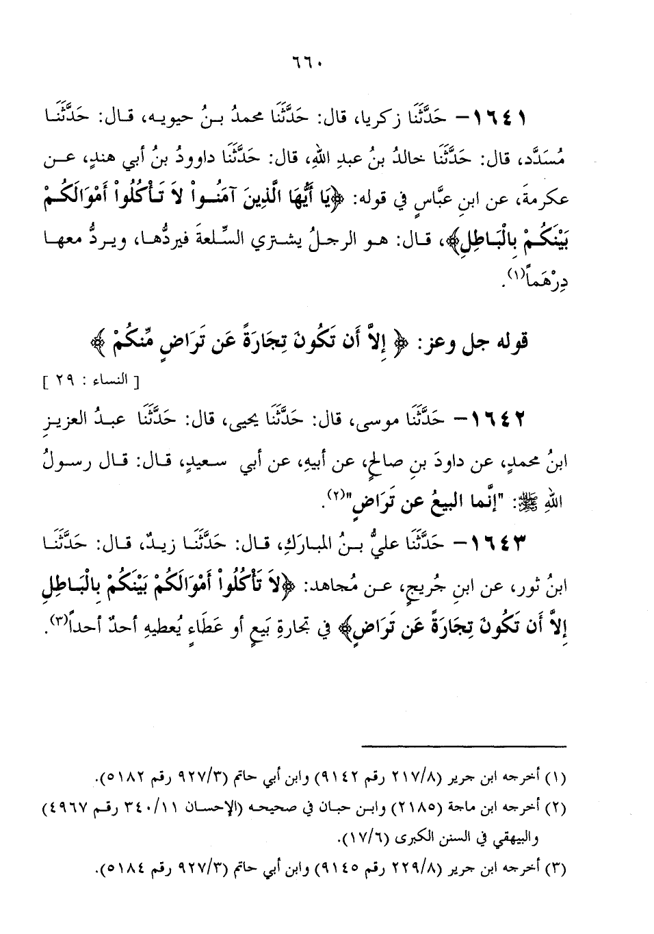 1641 - حَدَّثَنَا زَكَرِيَّا، قَالَ: حَدَّثَنَا مُحَمَّدُ بْنُ حَيَّوَيْهِ، قَالَ: حَدَّثَنَا مُسَدَّدٌ، قَالَ: حَدَّثَنَا خَالِدُ بْنُ عَبْدِ اللهِ، قَالَ: حَدَّثَنَا دَاوُدُ بْنُ أَبِي هِنْدٍ، عَنْ عِكْرِمَةَ، عَنِ ابْنِ عَبَّاسٍ فِي قوله: " {يَأَيُّهَا الَّذِينَ آمَنُوا لا تَأْكُلُوا أَمْوَالَكُمْ بَيْنَكُمْ بِالْبَاطِلِ} ، قَالَ: هُوَ الرَّجُلُ يَشْتَرِي السِّلْعَةَ فَيَرُدُّهَا، وَيَرُدُّ مَعَهَا دِرْهَمًا "