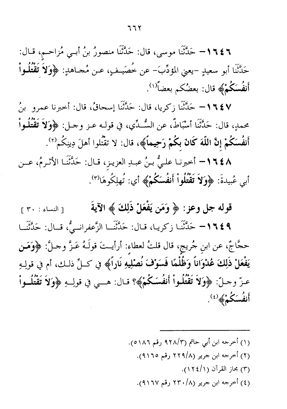 1648 - " أَخْبَرَنَا علي بْن عَبْدِ العزيز، قَالَ: حَدَّثَنَا الأثرم، عَنْ أبي عبيدة: " {وَلا تَقْتُلُوا أَنْفُسَكُمْ} أي: تهلكوها "
