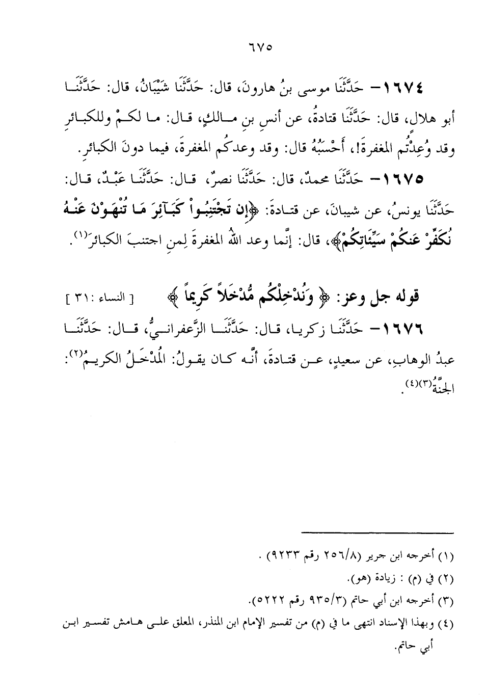 1675 - حَدَّثَنَا مُحَمَّد، قَالَ: حَدَّثَنَا نصر، قَالَ: حَدَّثَنَا عبد، قَالَ: حَدَّثَنَا يونس، عَنْ شيبان، عَنْ قتادة " {إِنْ تَجْتَنِبُوا كَبَائِرَ مَا تُنْهَوْنَ عَنْهُ نُكَفِّرْ عَنْكُمْ سَيِّئَاتِكُمْ} ، قَالَ: إنما وعد الله المغفرة لمن اجتنب الكبائر "