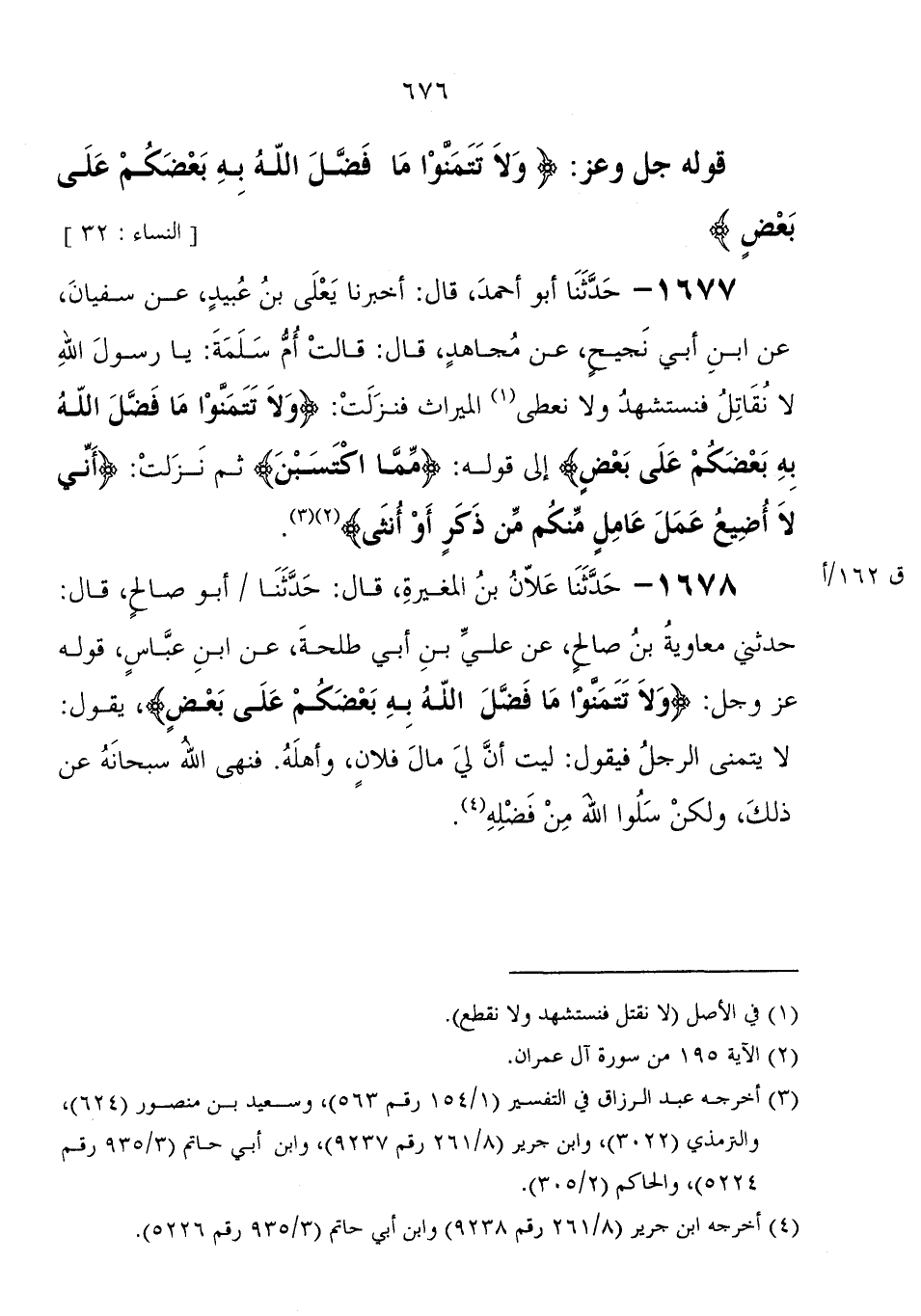 1677 - حَدَّثَنَا أَبُو أَحْمَدَ، قَالَ: أَخْبَرَنَا يَعْلَى بْنُ عُبَيْدٍ، عَنْ سُفْيَانَ، عَنِ ابْنِ أَبِي نَجِيحٍ، عَنْ مُجَاهِدٍ، قَالَ: قَالَتْ أُمُّ سَلَمَةَ: " يَا رَسُولَ اللهِ، لا نُقَاتِلُ فَنُسْتَشْهَدُ، وَلا نُعْطَى الْمِيرَاثَ فَنَزَلَتْ: {وَلا تَتَمَنَّوْا مَا فَضَّلَ اللهُ بِهِ بَعْضَكُمْ عَلَى بَعْضٍ إِلَى قوله: مِمَّا اكْتَسَبْنَ} ثُمَّ نَزَلَتْ: {أَنِّي لا أُضِيعُ عَمَلَ عَامِلٍ مِنْكُمْ مِنْ ذَكَرٍ أَوْ أُنْثَى} "