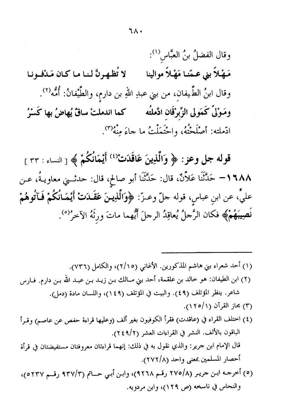 وَقَالَ الفضل بْن العباس: مهلا بني عمنا مهلا موالينا لا تظهرن لنا مَا كَانَ مدفونا وَقَالَ ابْنُ الطيفان، من بني عَبْد اللهِ بْن دارم، والطيفان: أمه ومولى كمولى الزبرقان أدملته كما اندملت ساق يهاض بها كسر أدملته: أصلحته، واحتملت مَا جاء منه قوله جَلَّ وَعَزَّ: {وَالَّذِينَ عَقَدَتْ أَيْمَانُكُمْ}