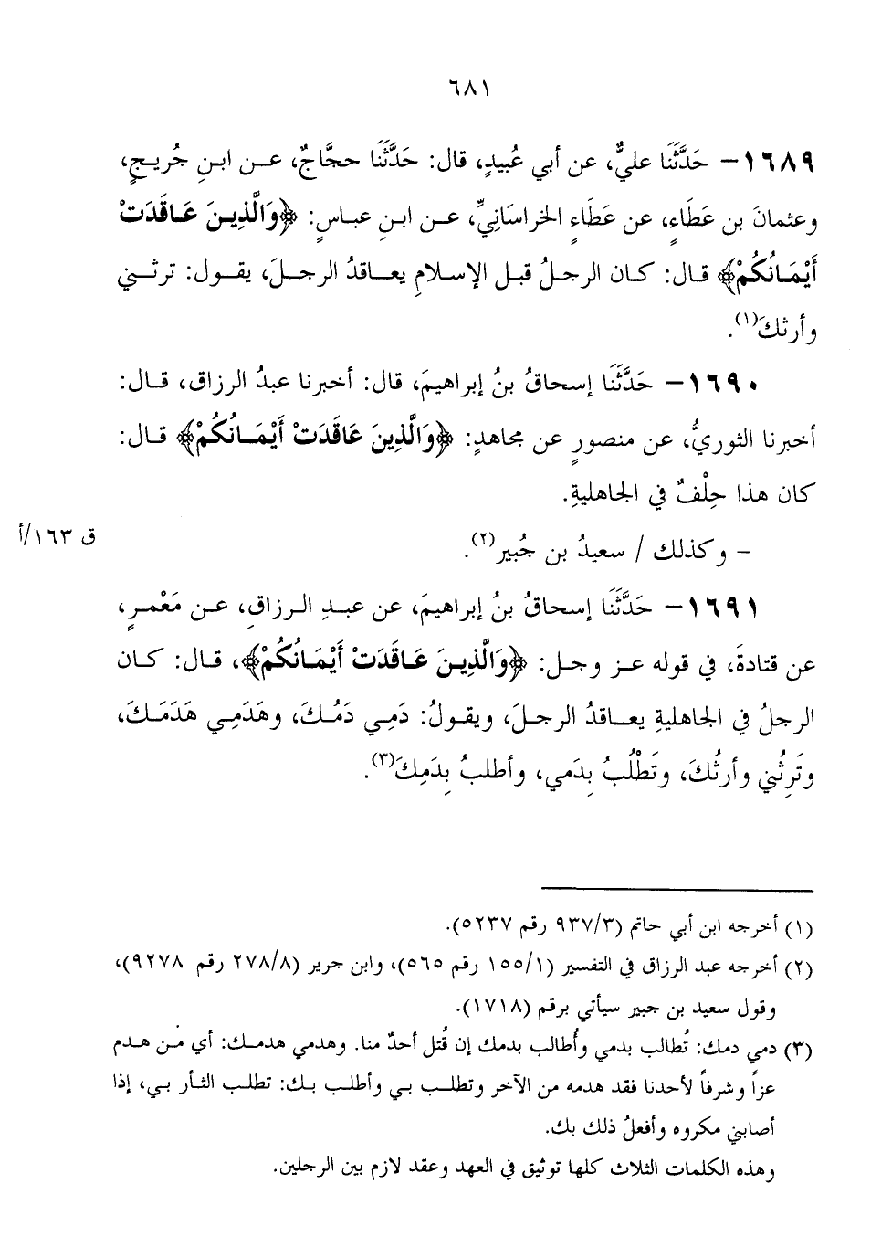 1690 - حَدَّثَنَا إِسْحَاق بْن إبراهيم، قَالَ: أَخْبَرَنَا عَبْد الرزاق، قَالَ: أَخْبَرَنَا الثوري، عَنْ منصور، عَنْ مجاهد " والذين عاقدت أيمانكم قَالَ: كَانَ