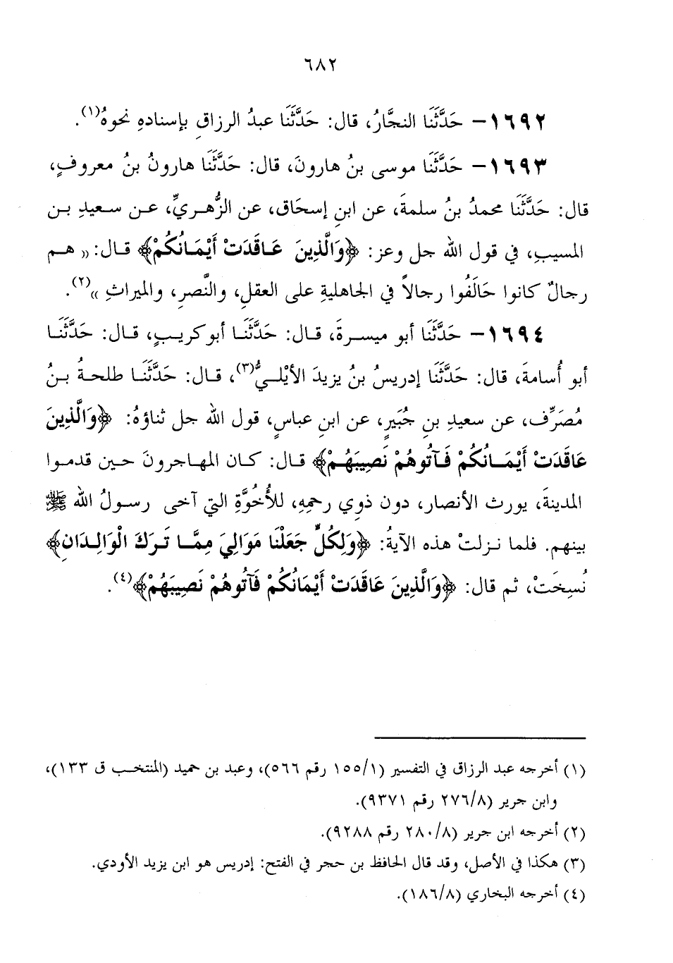 1693 - حَدَّثَنَا مُوسَى بْن هارون، قَالَ: حَدَّثَنَا هارون بْن معروف، قَالَ: حَدَّثَنَا مُحَمَّد بْن سلمة، عَنْ ابْن إِسْحَاقَ، عَنْ الزهري، عَنْ سعيد بْن المسيب، فِي قول الله جَلَّ وَعَزَّ " والذين عاقدت أيمانكم قَالَ: هم رجال كَانُوا حالفوا رجالا فِي الجاهلية عَلَى العقل، والنصر، والميرات "