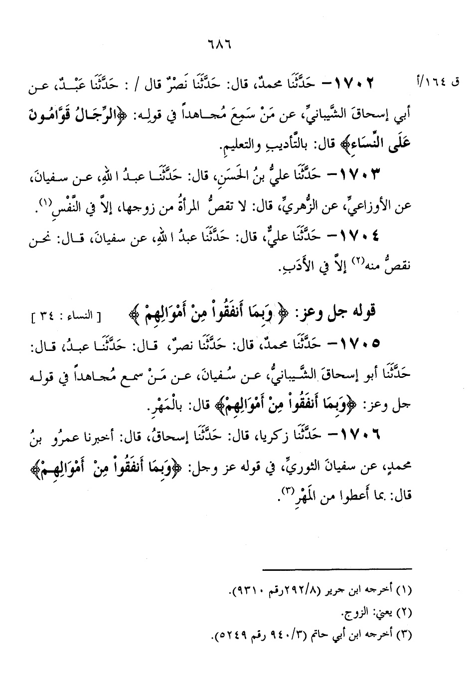 1705 - حَدَّثَنَا مُحَمَّد، قَالَ: حَدَّثَنَا نصر، قَالَ: حَدَّثَنَا عبد، قَالَ: حَدَّثَنَا أَبُو إِسْحَاق الشيباني، عَنْ سُفْيَانَ، عَنْ من سمع مجاهدا، فِي قوله جَلَّ وَعَزَّ " {وَبِمَا أَنْفَقُوا مِنْ أَمْوَالِهِمْ} قَالَ: بالمهر "