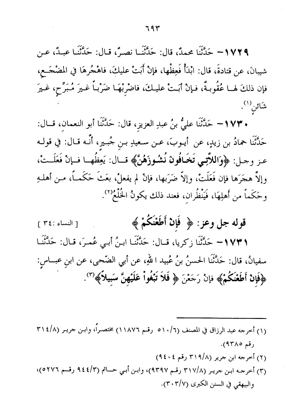 1731 - حَدَّثَنَا زَكَرِيَّا، قَالَ: حَدَّثَنَا ابْنُ أَبِي عُمَرَ، قَالَ: حَدَّثَنَا سُفْيَانُ، قَالَ: حَدَّثَنَا الْحَسَنُ بْنُ عُبَيْدِ اللهِ، عَنْ أَبِي الضُّحَى، عَنِ ابْنِ عَبَّاسٍ: " {فَإِنْ أَطَعْنَكُمْ} فَإِنْ رَجِعْنَ {فَلا تَبْغُوا عَلَيْهِنَّ سَبِيلا} "