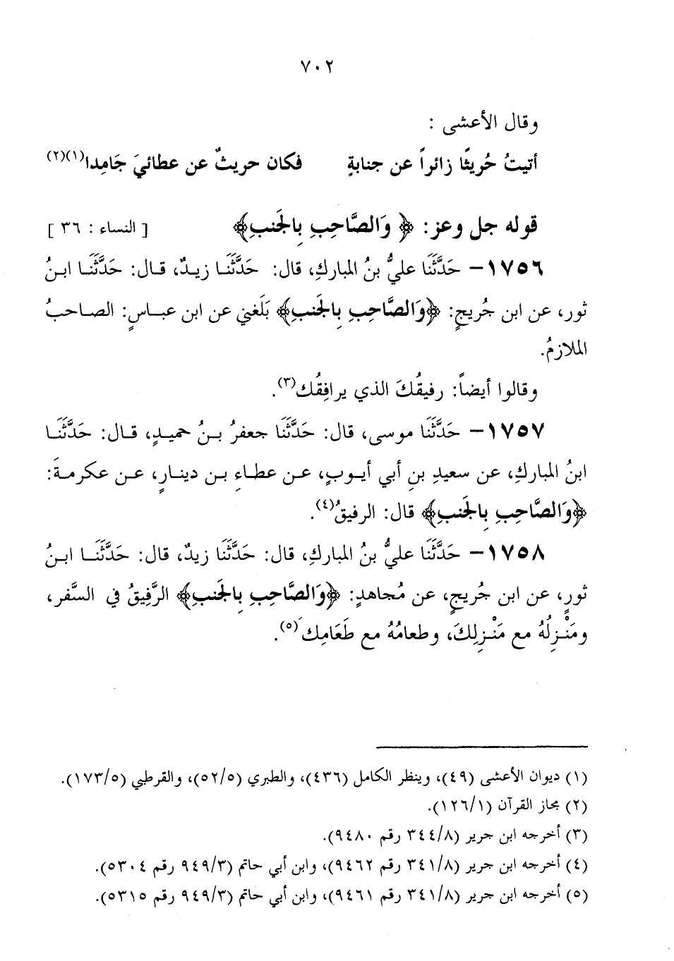 1758 - حَدَّثَنَا عَلِيُّ بْنُ الْمُبَارَكِ، قَالَ: حَدَّثَنَا زَيْدٌ، قَالَ: حَدَّثَنَا ابْنُ ثَوْرٍ، عَنِ ابْنِ جُرَيْجٍ، عَنْ مجاهد، " {وَالصَّاحِبِ بِالْجَنْبِ} ، الرفيق فِي السفر، ومنزله مَعَ منزلك، وطعامه مَعَ طعامك "