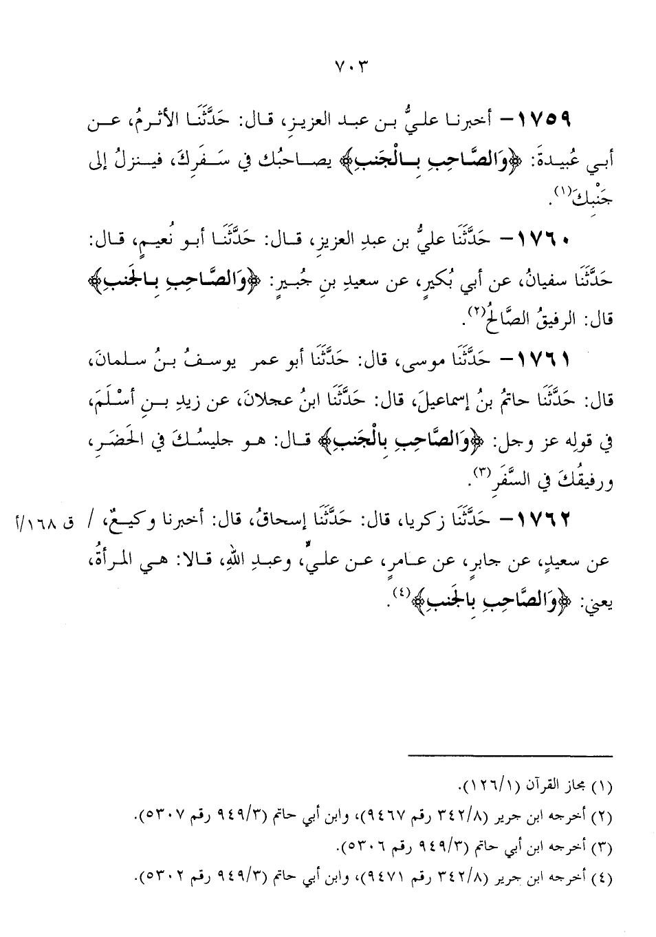1760 - حَدَّثَنَا عَلِيُّ بْنُ عَبْدِ الْعَزِيزِ، قَالَ: حَدَّثَنَا أَبُو نعيم، قَالَ: حَدَّثَنَا سُفْيَانُ، عَنْ أبي بكير، عَنْ سعيد بْن جبير " {وَالصَّاحِبِ بِالْجَنْبِ} ، قَالَ: الرفيق الصالح "