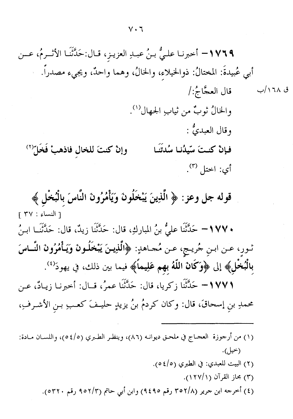 1770 - حَدَّثَنَا عَلِيُّ بْنُ الْمُبَارَكِ، قَالَ: حَدَّثَنَا زَيْدٌ، قَالَ: حَدَّثَنَا ابْنُ ثَوْرٍ، عَنِ ابْنِ جُرَيْجٍ، عَنْ مجاهد " {الَّذِينَ يَبْخَلُونَ وَيَأْمُرُونَ النَّاسَ بِالْبُخْلِ إِلَى وَكَانَ اللهُ بِهِمْ عَلِيمًا} فيما بين ذَلِكَ، فِي يهود "