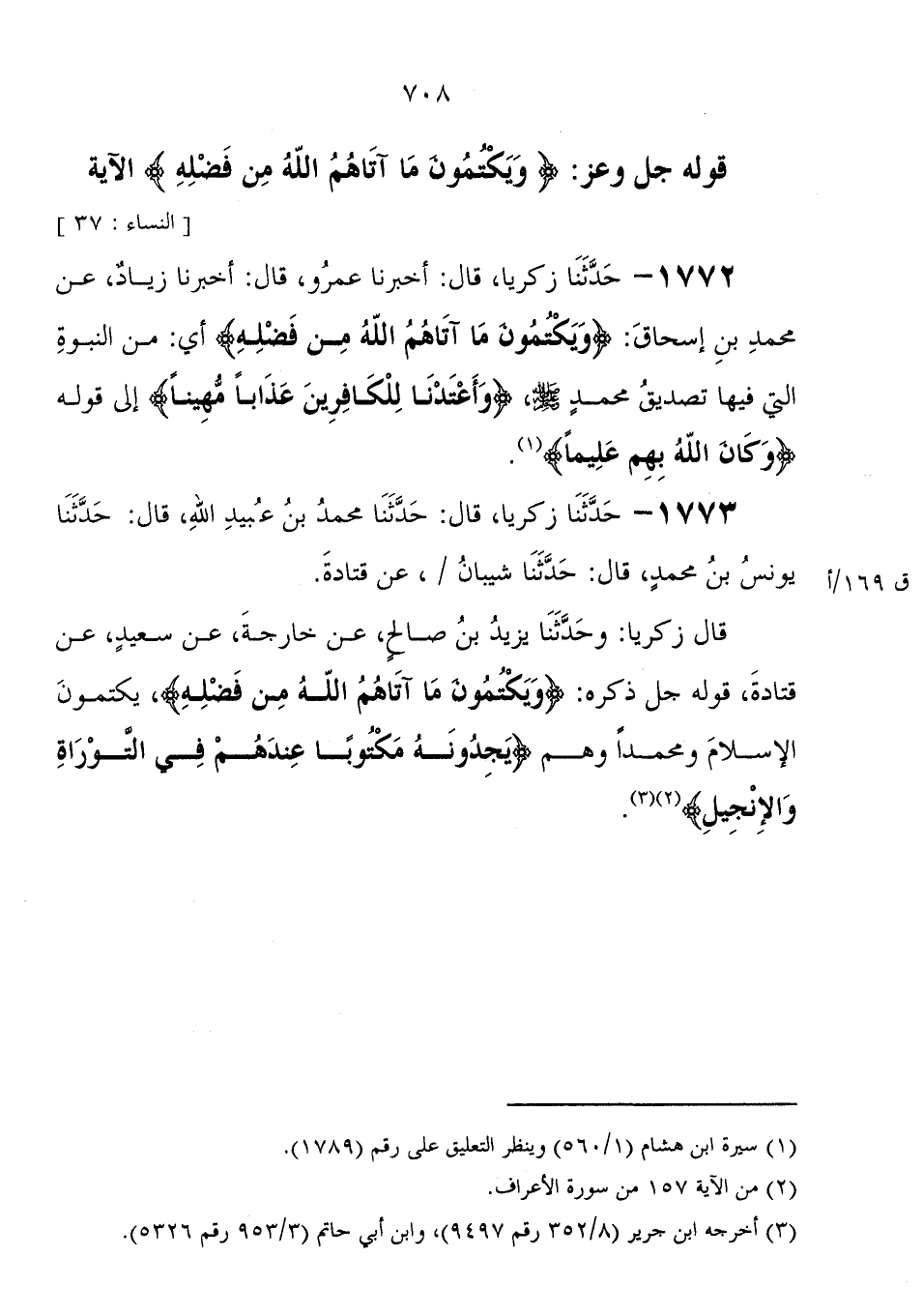 1773 - حَدَّثَنَا زكريا، قَالَ: حَدَّثَنَا مُحَمَّد بْن عبيد الله، قَالَ: حَدَّثَنَا يونس بْن مُحَمَّدٍ، قَالَ: حَدَّثَنَا شيبان، عَنْ قتادة قَالَ زكريا وحدثنا يزيد بْن صالح، عَنْ خارجه، عَنْ سعيد، عَنْ قتادة، قوله جل ذكره " {وَيَكْتُمُونَ مَا آتَاهُمُ اللهُ مِنْ فَضْلِهِ} يكتمون الإسلام ومُحَمَّدا وهم {يَجِدُونَهُ مَكْتُوبًا عِنْدَهُمْ فِي التَّوْرَاةِ وَالإِنْجِيلِ} "