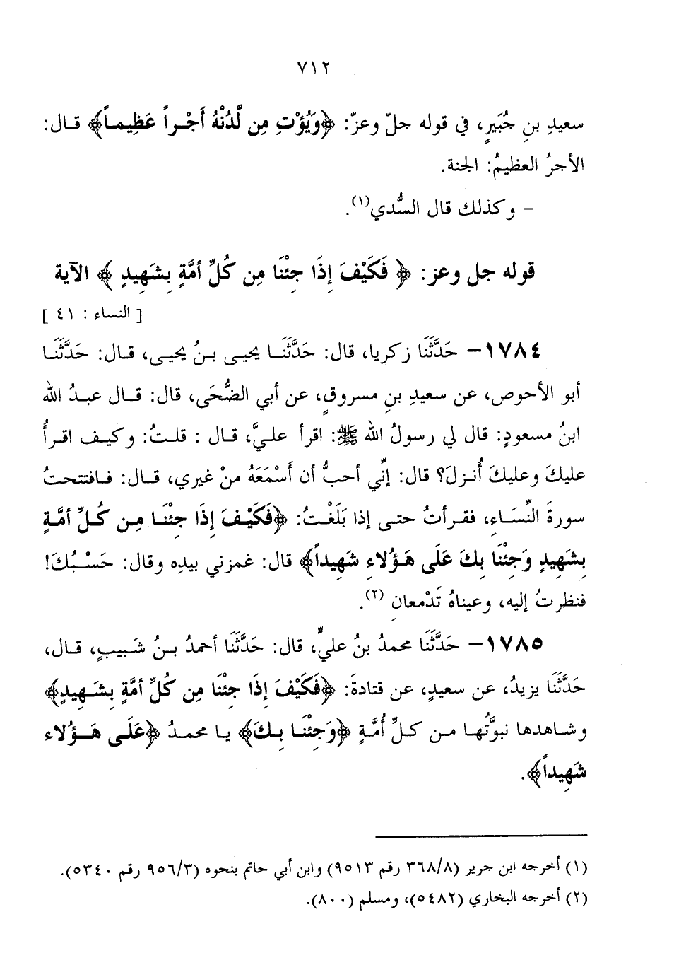 1785 - حَدَّثَنَا مُحَمَّد بْن علي، قَالَ: حَدَّثَنَا أَحْمَدُ بْنُ شبيب، قَالَ: حَدَّثَنَا يزيد، عَنْ سعيد، عَنْ قتادة " {فَكَيْفَ إِذَا جِئْنَا مِنْ كُلِّ أُمَّةٍ بِشَهِيدٍ} وشاهدها نبوتها من كل أمة {وَجِئْنَا بِكَ} يَا مُحَمَّد {عَلَى هَؤُلاءِ شَهِيدًا} "