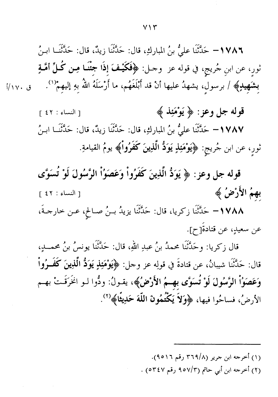 1786 - حَدَّثَنَا عَلِيُّ بْنُ الْمُبَارَكِ، قَالَ: حَدَّثَنَا زَيْدٌ، قَالَ: حَدَّثَنَا ابْنُ ثَوْرٍ، عَنِ ابْنِ جُرَيْجٍ، فِي قوله عَزَّ وَجَلَّ " {فَكَيْفَ إِذَا جِئْنَا مِنْ كُلِّ أُمَّةٍ بِشَهِيدٍ} برسول يشهد عليها أنه قد أبلغهم مَا أرسله الله به إليهم "