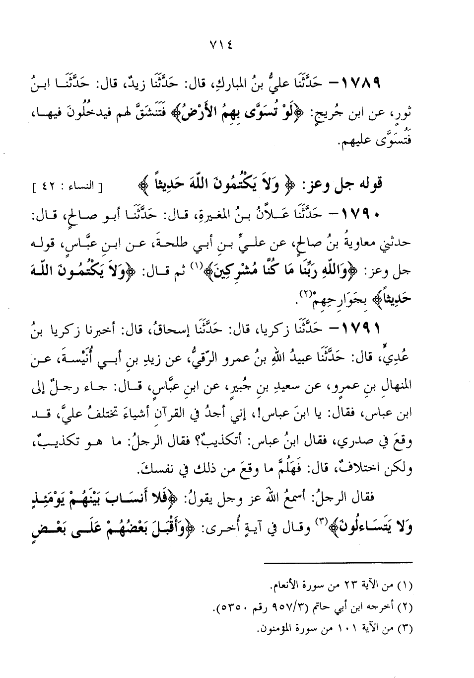 1790 - حَدَّثَنَا عَلانُ بْنُ الْمُغِيرَةِ، قَالَ: حَدَّثَنَا أَبُو صَالِحٍ، قَالَ: حَدَّثَنِي مُعَاوِيَةُ بْنُ صَالِحٍ، عَنْ عَلِيِّ بْنِ أَبِي طَلْحَةَ، عَنِ ابْنِ عَبَّاسٍ، قوله جَلَّ وَعَزَّ " {وَاللهِ رَبِّنَا مَا كُنَّا مُشْرِكِينَ} ، ثُمَّ قَالَ: {وَلا يَكْتُمُونَ اللهَ حَدِيثًا} ، بِجَوَارِحِهُمْ "