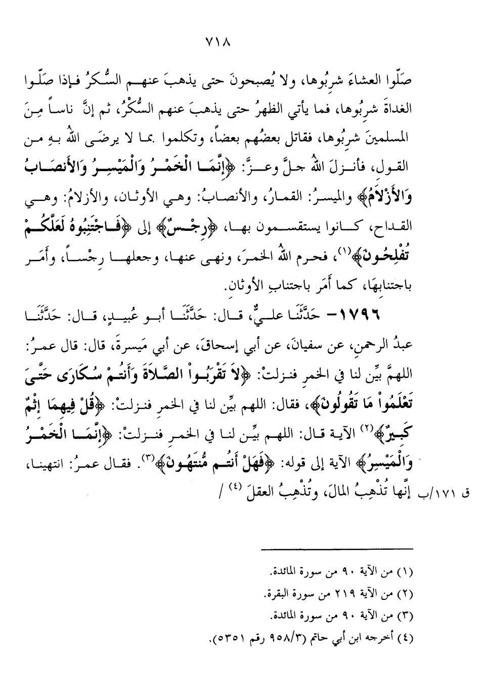 1796 - حَدَّثَنَا عَلِيٌّ، قَالَ: حَدَّثَنَا أَبُو عُبَيْدٍ، قَالَ: حَدَّثَنَا عَبْدُ الرَّحْمَنِ، عَنْ سُفْيَانَ، عَنْ أَبِي إِسْحَاقَ، عَنْ أَبِي مَيْسَرَةَ، قَالَ: قَالَ: عُمَرُ: " اللهُمَّ بَيِّنْ لَنَا فِي الْخَمْرِ فَنَزَلَتْ: {لا تَقْرَبُوا الصَّلاةَ وَأَنْتُمْ سُكَارَى حَتَّى تَعْلَمُوا مَا تَقُولُونَ} ، فَقَالَ: اللهُمَّ بَيِّنْ لَنَا فِي الْخَمْرِ فَنَزَلَتْ: {قُلْ فِيهِمَا إِثْمٌ كَبِيرٌ} الآيَةُ، قَالَ: اللهُمَّ بَيِّنْ لَنَا فِي الْخَمْرِ فَنَزَلَتْ: {إِنَّمَا الْخَمْرُ وَالْمَيْسِرُ إِلَى قوله: فَهَلْ أَنْتُمْ مُنْتَهُونَ} فَقَالَ عُمَرُ: انْتَهَيْنَا، إِنَّهَا تُذْهِبُ الْمَالَ، وَتُذْهِبُ الْعَقْلَ "