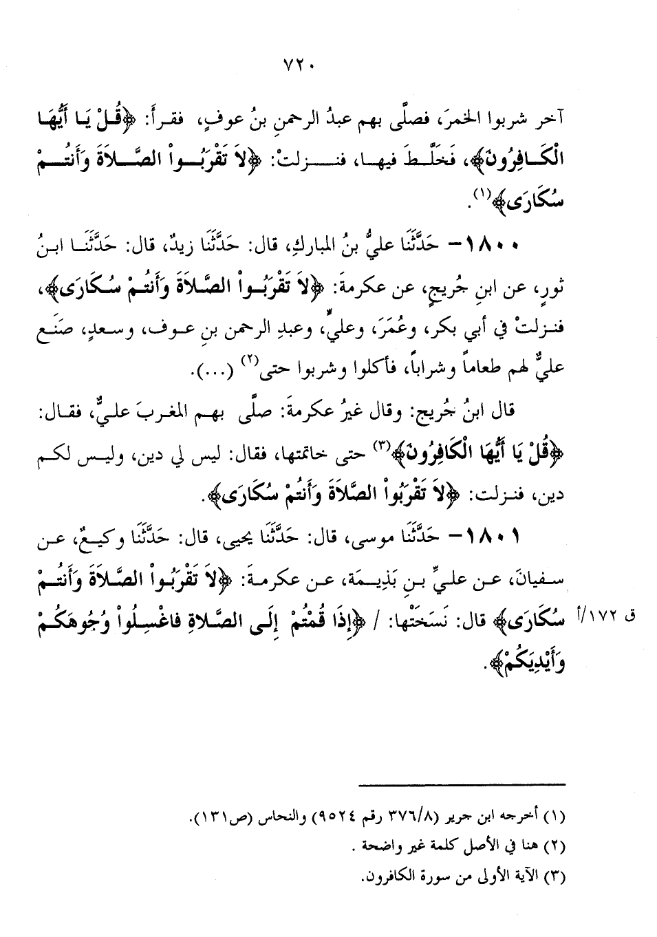 1800 - حَدَّثَنَا عَلِيُّ بْنُ الْمُبَارَكِ، قَالَ: حَدَّثَنَا زَيْدٌ، قَالَ: حَدَّثَنَا ابْنُ ثَوْرٍ، عَنِ ابْنِ جُرَيْجٍ، عَنْ عكرمة " {لا تَقْرَبُوا الصَّلاةَ وَأَنْتُمْ سُكَارَى} ، فنزلت فِي أبي بكر، وعمر، وعلي، وعَبْد الرَّحْمَنِ بْن عوف، وسعد، صنع علي لهم طعاما وشرابا، فأكلوا وشربوا حَتَّى قَالَ ابْنُ جريج: وَقَالَ غير عكرمة: صلى بهم المغرب علي،
