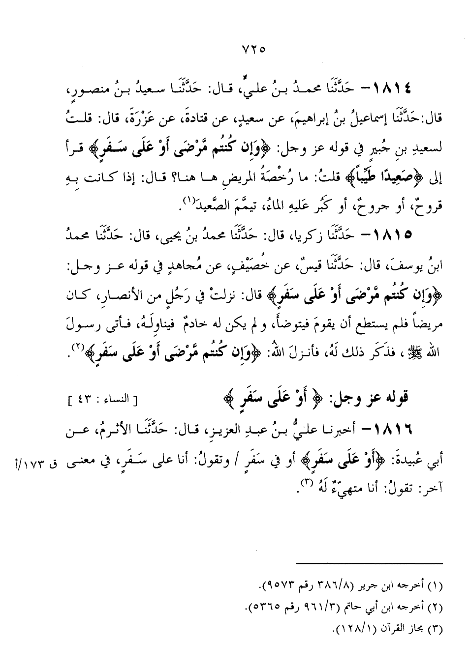 1814 - حَدَّثَنَا مُحَمَّد بْن علي، قَالَ: حَدَّثَنَا سعيد بْن منصور، حَدَّثَنَا إسماعيل بْن إبراهيم، عَنْ سعيد، عَنْ قتادة، عَنْ عزرة، قَالَ: قلت: لسعيد بْن جبير، فِي قوله عَزَّ وَجَلَّ " {وَإِنْ كُنْتُمْ مَرْضَى أَوْ عَلَى سَفَرٍ} قرأ إِلَى: {صَعِيدًا طَيِّبًا} ، قلت: مَا رخصة المريض ها هنا؟ قَالَ: إذا كانت به قروح، أو جروح، أو كبر عَلَيْهِ الماء، تيمم الصعيد "