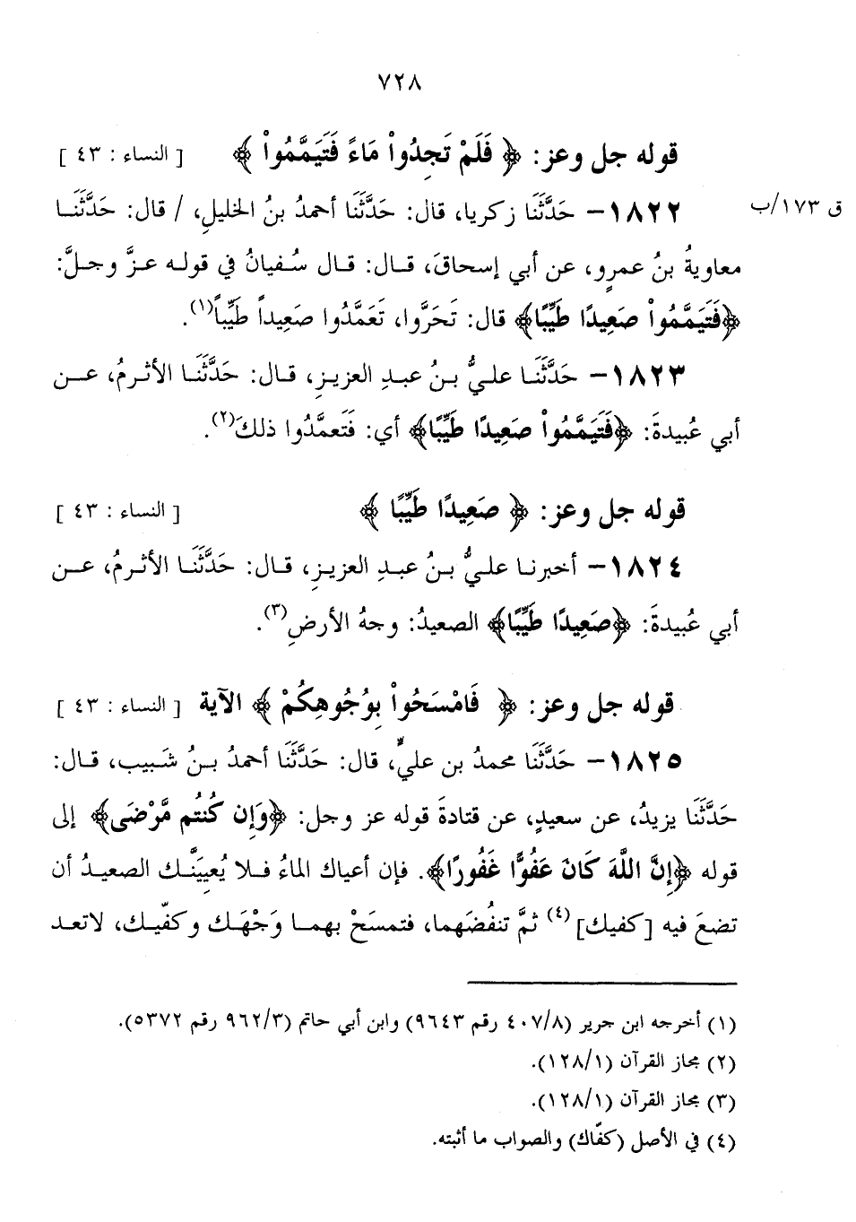 1822 - حَدَّثَنَا زكريا، قَالَ: حَدَّثَنَا أَحْمَدُ بْنُ الخليل، قَالَ: حَدَّثَنَا معاوية بْن عمرو، عَنْ أبي إِسْحَاق، قَالَ: قَالَ سُفْيَان فِي قوله عَزَّ وَجَلَّ " {فَتَيَمَّمُوا صَعِيدًا طَيِّبًا} ، قَالَ: تحروا، تعمدوا صعيدا طيبا "